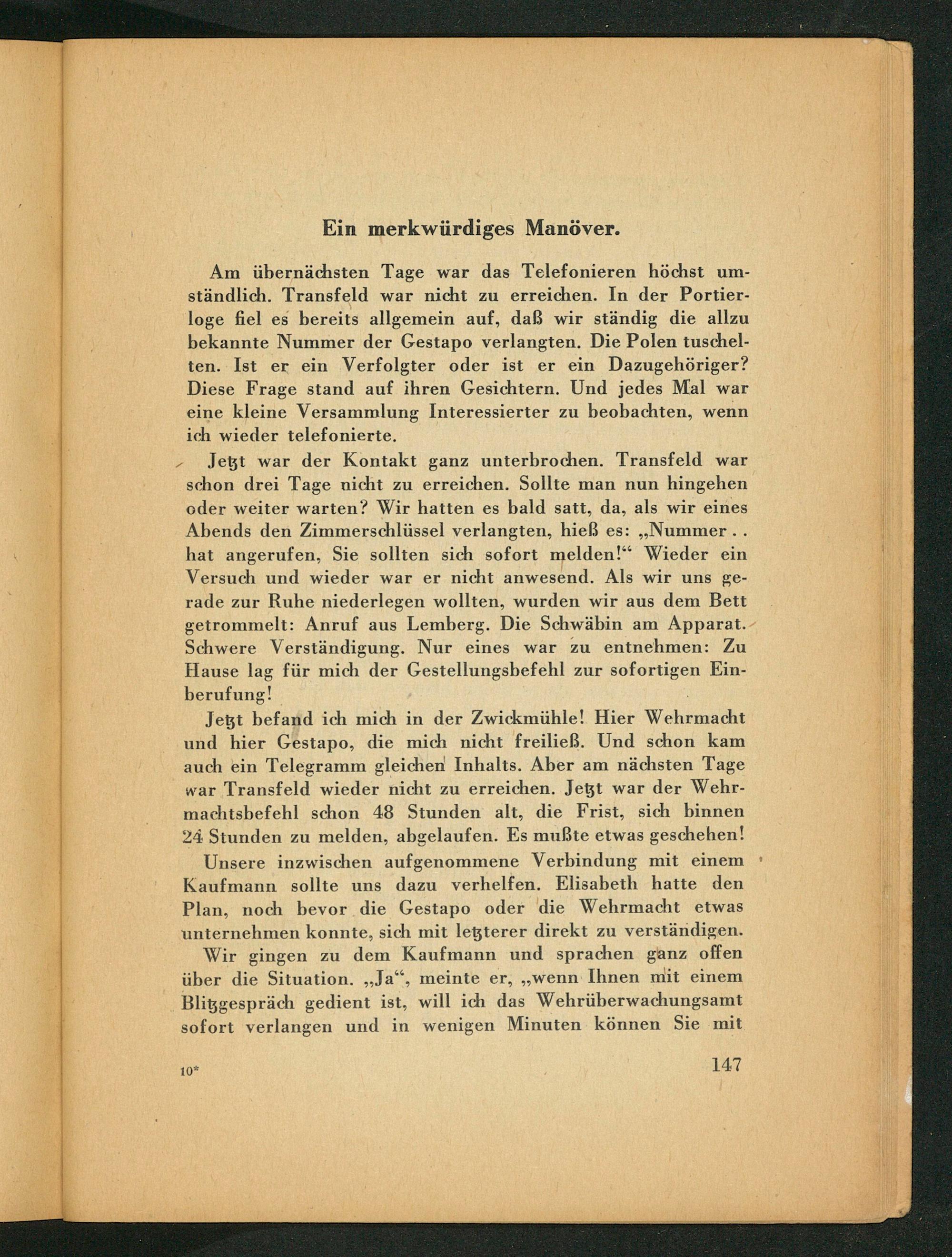 Unsere inzwischen aufgenommene Verbindung mit einem Kaufmann sollte uns dazu verhelfen. Elisabeth hatte den Plan, noch bevor die Gestapo oder die Wehrmacht etwas unternehmen konnte, sich mit letzterer direkt zu verständigen. Wir gingen zu dem Kaufmann und sprachen ganz offen über die Situation. ,, Ja", meinte er ,,, wenn Ihnen mit einem Blitzgespräch gedient ist, will ich das Wehrüberwachungsamt sofort verlangen und in wenigen Minuten können Sie mit