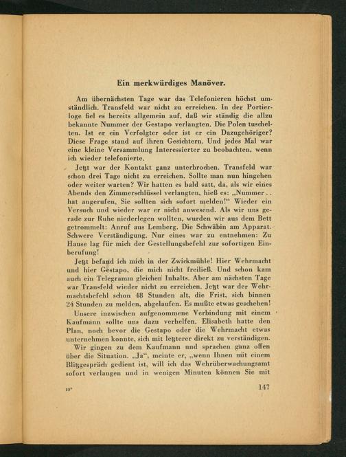 Jetzt war der Kontakt ganz unterbrochen. Transfeld war schon drei Tage nicht zu erreichen. Sollte man nun hingehen oder weiter warten? Wir hatten es bald satt, da, als wir eines Abends den Zimmerschlüssel verlangten, hieß es: ,, Nummer.. hat angerufen, Sie sollten sich sofort melden!" Wieder ein Versuch und wieder war er nicht anwesend. Als wir uns gerade zur Ruhe niederlegen wollten, wurden wir aus dem Bett getrommelt: Anruf aus Lemberg . Die Schwäbin am Apparat. Schwere Verständigung. Nur eines war zu entnehmen: Zu Hause lag für mich der Gestellungsbefehl zur sofortigen Einberufung!