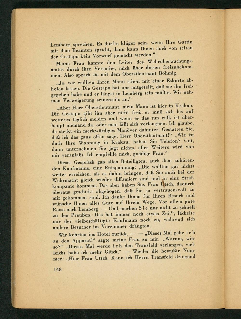 Dieses Gespräch gab allen Beteiligten, auch dem zuhörenden Kaufmanne, eine Entspannung: Die wollten gar nichts weiter erreichen, als es dahin bringen, daß Sie auch bei der Wehrmacht gleich wieder diffamiert sind und in eine Strafkompanie kommen. Das aber haben Sie, Frau Utsch, dadurch überaus geschickt abgebogen, daß Sie so vertrauensvoll zu mir gekommen sind. Ich danke Ihnen für Ihren Besuch und wünsche Ihnen alles Gute auf Ihrem Wege. Vor allem gute Reise nach Lemberg . Und machen Sie nur nicht zu schnell zu den Preußen. Das hat immer noch etwas Zeit", lächelte mir der vielbeschäftigte Kaufmann noch zu, während sich andere Besucher im Vorzimmer drängten.