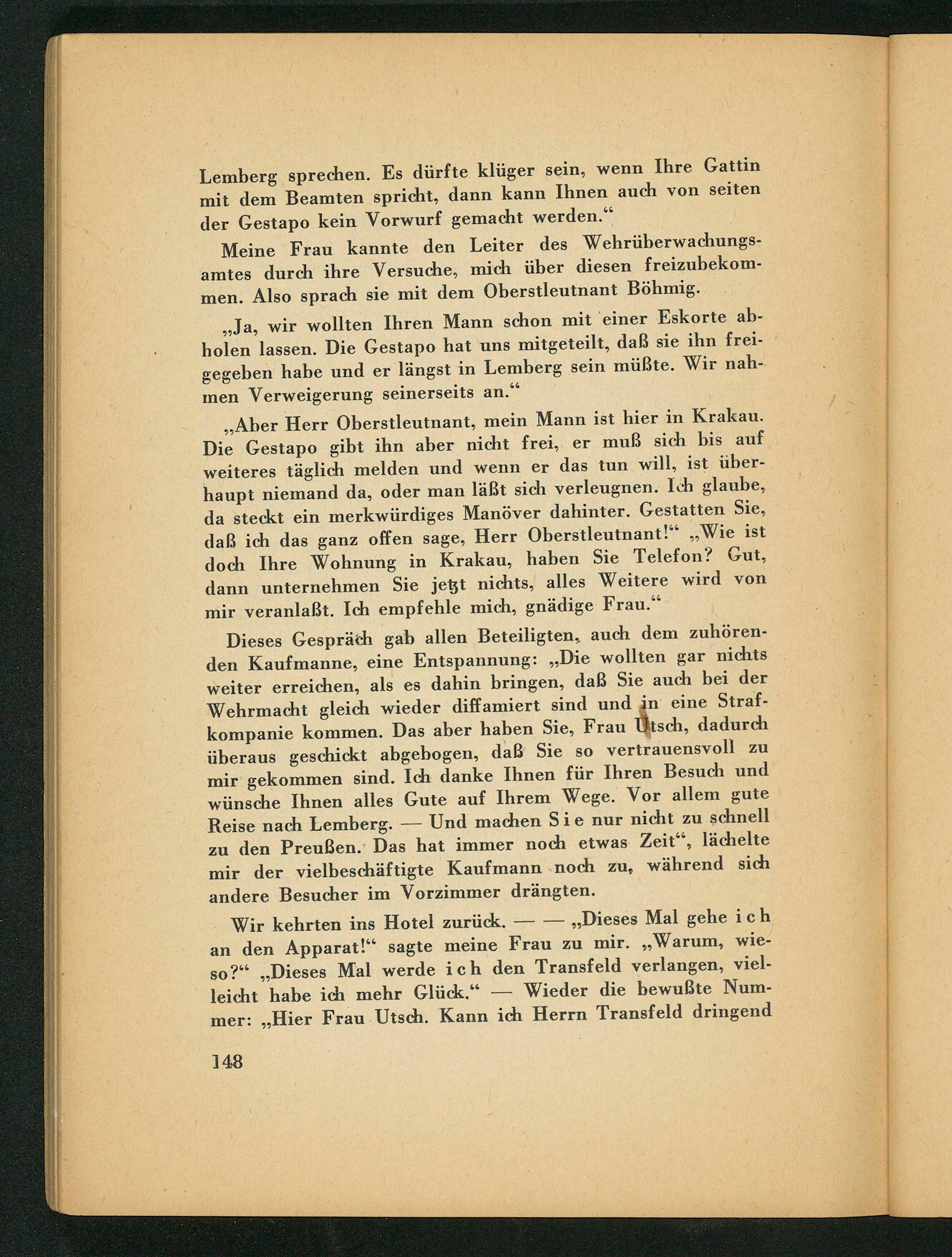 Lemberg sprechen. Es dürfte klüger sein, wenn Ihre Gattin mit dem Beamten spricht, dann kann Ihnen auch von seiten der Gestapo kein Vorwurf gemacht werden."
