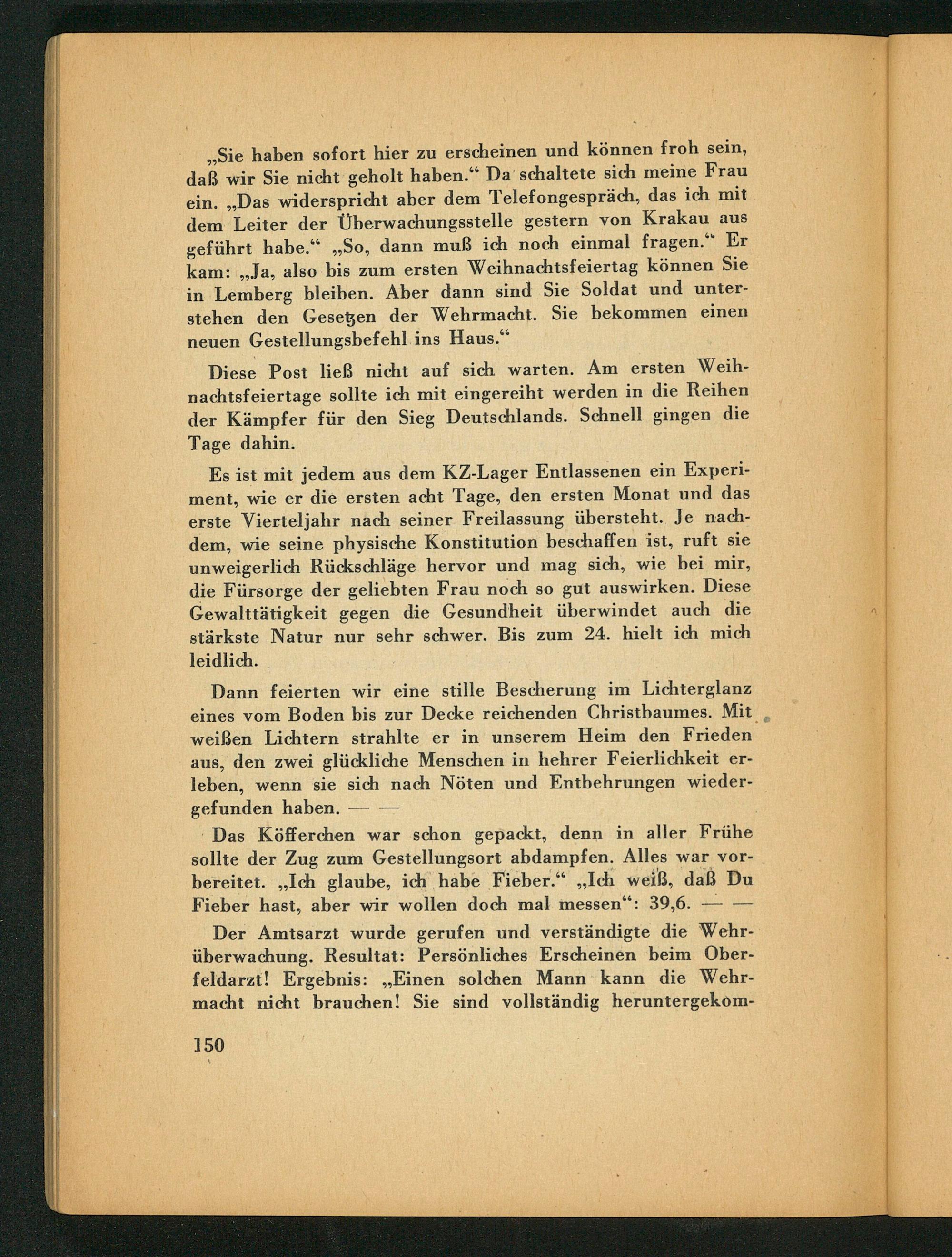 ,, Sie haben sofort hier zu erscheinen und können froh sein, daß wir Sie nicht geholt haben." Da schaltete sich meine Frau ein. ,, Das widerspricht aber dem Telefongespräch, das ich mit dem Leiter der Überwachungsstelle gestern von Krakau aus geführt habe." ,, So, dann muß ich noch einmal fragen." Er kam: ,, Ja, also bis zum ersten Weihnachtsfeiertag können Sie in Lemberg bleiben. Aber dann sind Sie Soldat und unterstehen den Gesetzen der Wehrmacht . Sie bekommen einen neuen Gestellungsbefehl ins Haus."