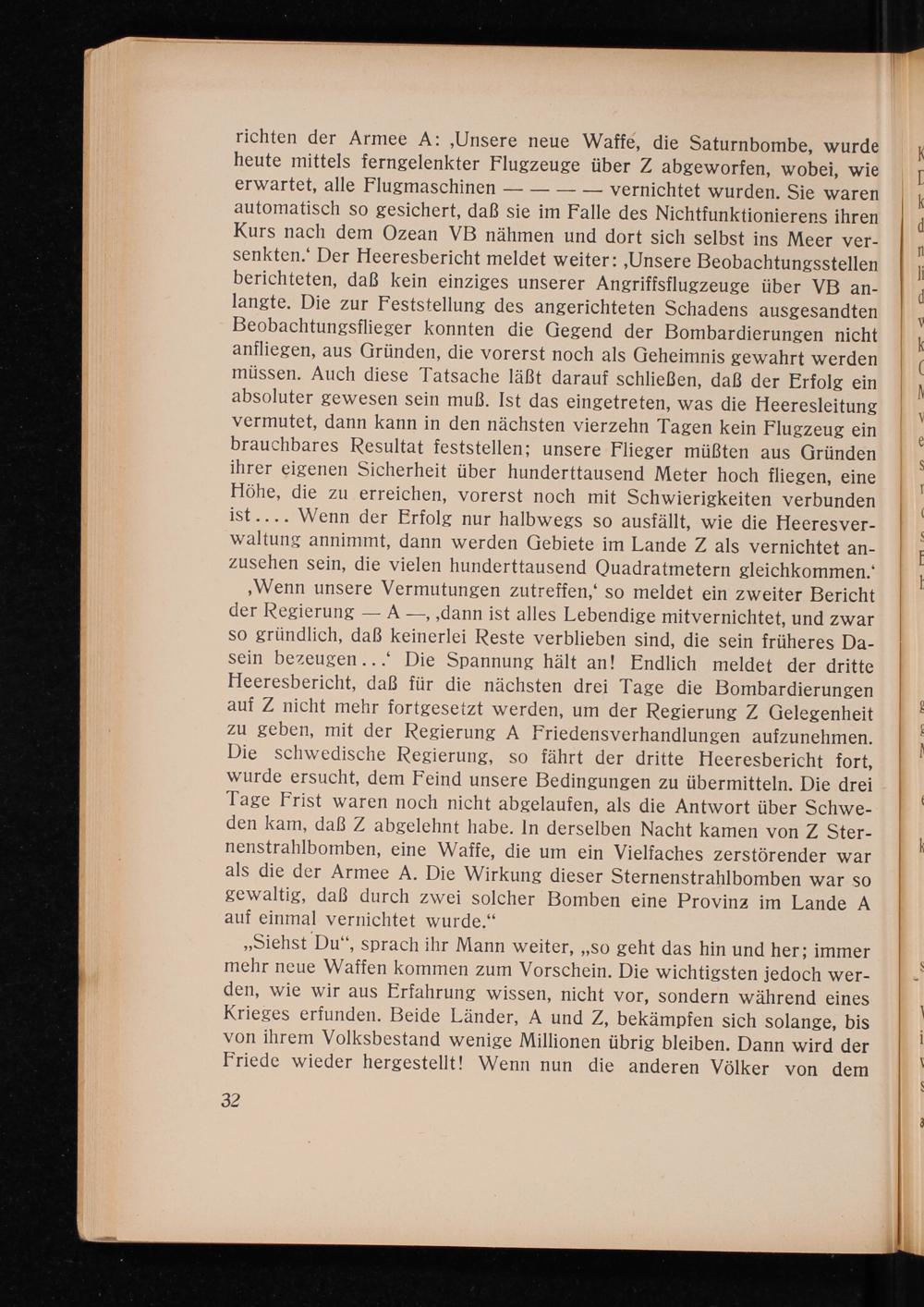 richten der Armee A: ‚Unsere neue Waffe, die Saturnbombe, wurde heute mittels ferngelenkter Flugzeuge über Z abgeworfen, wobei, wie erwartet, alle Flugmaschinen———— vernichtet wurden. Sie waren automatisch so gesichert, daß sie im Falle des Nichtfunktionierens ihren Kurs nach dem Ozean VB nähmen und dort sich selbst ins Meer ver- senkten.‘ Der Heeresbericht meldet weiter: ‚Unsere Beobachtungsstellen berichteten, daß kein einziges unserer Angriffsflugzeuge über VB an- langte. Die zur Feststellung des angerichteten Schadens ausgesandten Beobachtungsflieger konnten die Gegend der Bombardierungen nicht anfliegen, aus Gründen, die vorerst noch als Geheimnis gewahrt werden müssen. Auch diese Tatsache läßt darauf schließen, daß der Erfolg ein absoluter gewesen sein muß. Ist das eingetreten, was die Heeresleitung vermutet, dann kann in den nächsten vierzehn Tagen kein Flugzeug ein brauchbares Resultat feststellen; unsere Flieger müßten aus Gründen ihrer eigenen Sicherheit über hunderttausend Meter hoch fliegen, eine Höhe, die zu erreichen, vorerst noch mit Schwierigkeiten verbunden ist.... Wenn der Erfolg nur halbwegs so ausfällt, wie die Heeresver- waltung annimmt, dann werden Gebiete im Lande Z als vernichtet an- zusehen sein, die vielen hunderttausend Quadratmetern gleichkommen.‘