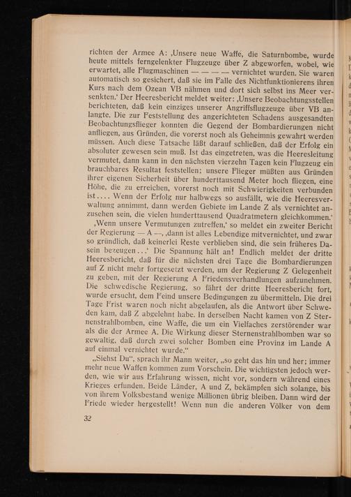 ‚Wenn unsere Vermutungen zutreffen,‘ so meldet ein zweiter Bericht der Regierung— A—, ‚dann ist alles Lebendige mitvernichtet, und zwar so gründlich, daß keinerlei Reste verblieben sind, die sein früheres Da- sein bezeugen...‘ Die Spannung hält an! Endlich meldet der dritte Heeresbericht, daß für die nächsten drei Tage die Bombardierungen auf Z nicht mehr fortgesetzt werden, um der Regierung Z Gelegenheit zu geben, mit der Regierung A Friedensverhandlungen aufzunehmen. Die schwedische Regierung, so fährt der dritte Heeresbericht fort, wurde ersucht, dem Feind unsere Bedingungen zu übermitteln. Die drei Tage Frist waren noch nicht abgelaufen, als die Antwort über Schwe- den kam, daß Z abgelehnt habe. In derselben Nacht kamen von Z Ster- nenstrahlbomben, eine Waffe, die um ein Vielfaches zerstörender war als die der Armee A. Die Wirkung dieser Sternenstrahlbomben war so gewaltig, daß durch zwei solcher Bomben eine Provinz im Lande A auf einmal vernichtet wurde.“