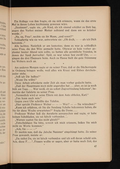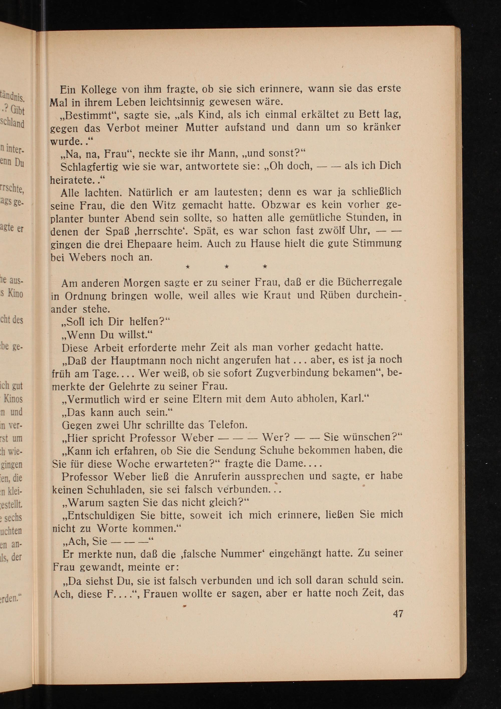 Alle lachten. Natürlich er am lautesten; denn es war ja schließlich seine Frau, die den Witz gemacht hatte. Obzwar es kein vorher ge- planter bunter Abend sein sollte, so hatten alle gemütliche Stunden, in denen der Spaß ‚herrschte‘. Spät, es war schon fast zwölf Uhr,—— gingen die drei Ehepaare heim. Auch zu Hause hielt die gute Stimmung bei Webers noch an.