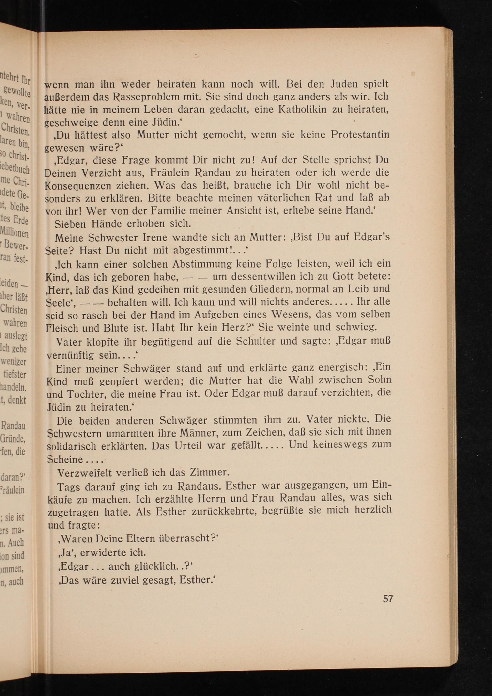 wenn man ihn weder heiraten kann noch will. Bei den Juden spielt außerdem das Rasseproblem mit. Sie sind doch ganz anders als wir. Ich hätte nie in meinem Leben daran gedacht, eine Katholikin zu heiraten,
