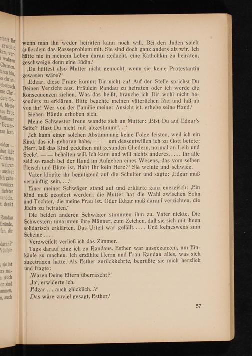 Einer meiner Schwäger stand auf und erklärte ganz energisch:, Ein Kind muß geopfert werden; die Mutter hat die Wahl zwischen Sohn und Tochter, die meine Frau ist. Oder Edgar muß darauf verzichten, die Jüdin zu heiraten.'