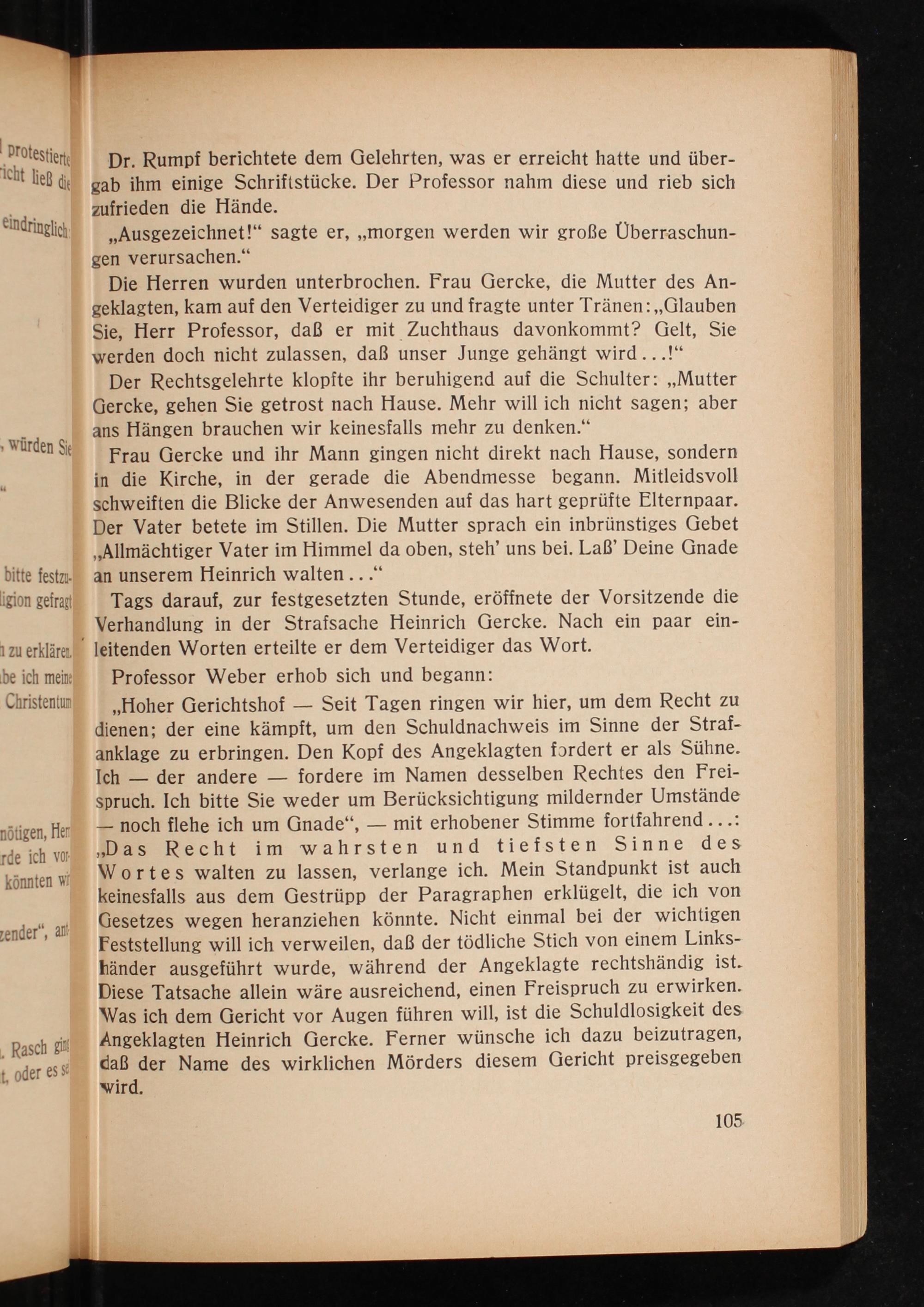 ..Hoher Gerichtshof- Seit Tagen ringen wir hier, um dem Recht zu dienen; der eine kämpft, um den Schuldnachweis im Sinne der Strafanklage zu erbringen. Den Kopf des Angeklagten fordert er als Sühne. Ich der andere fordere im Namen desselben Rechtes den Freispruch. Ich bitte Sie weder um Berücksichtigung mildernder Umstände noch flehe ich um Gnade", mit erhobener Stimme fortfahrend...: ,, Das Recht im wahrsten und tiefsten Sinne des Wortes walten zu lassen, verlange ich. Mein Standpunkt ist auch keinesfalls aus dem Gestrüpp der Paragraphen erklügelt, die ich von Gesetzes wegen heranziehen könnte. Nicht einmal bei der wichtigen Feststellung will ich verweilen, daß der tödliche Stich von einem Linkshänder ausgeführt wurde, während der Angeklagte rechtshändig ist. Diese Tatsache allein wäre ausreichend, einen Freispruch zu erwirken. Was ich dem Gericht vor Augen führen will, ist die Schuldlosigkeit des Angeklagten Heinrich Gercke. Ferner wünsche ich dazu beizutragen, daß der Name des wirklichen Mörders diesem Gericht preisgegeben wird.
