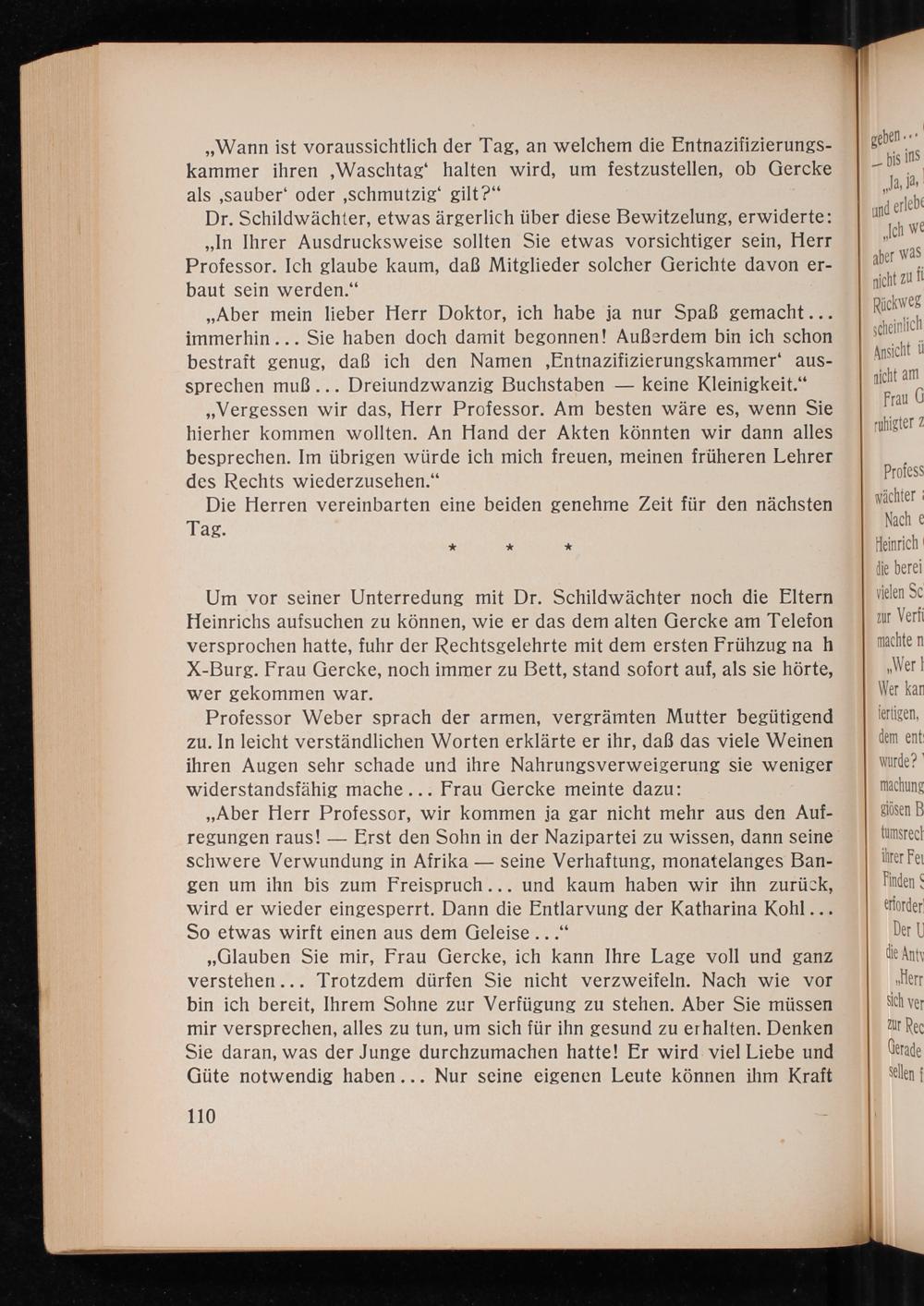 ,, Aber mein lieber Herr Doktor, ich habe ja nur Spaß gemacht... immerhin... Sie haben doch damit begonnen! Außerdem bin ich schon bestraft genug, daß ich den Namen, Entnazifizierungskammer' aussprechen muß... Dreiundzwanzig Buchstaben keine Kleinigkeit." ,, Vergessen wir das, Herr Professor. Am besten wäre es, wenn Sie hierher kommen wollten. An Hand der Akten könnten wir dann alles besprechen. Im übrigen würde ich mich freuen, meinen früheren Lehrer des Rechts wiederzusehen."