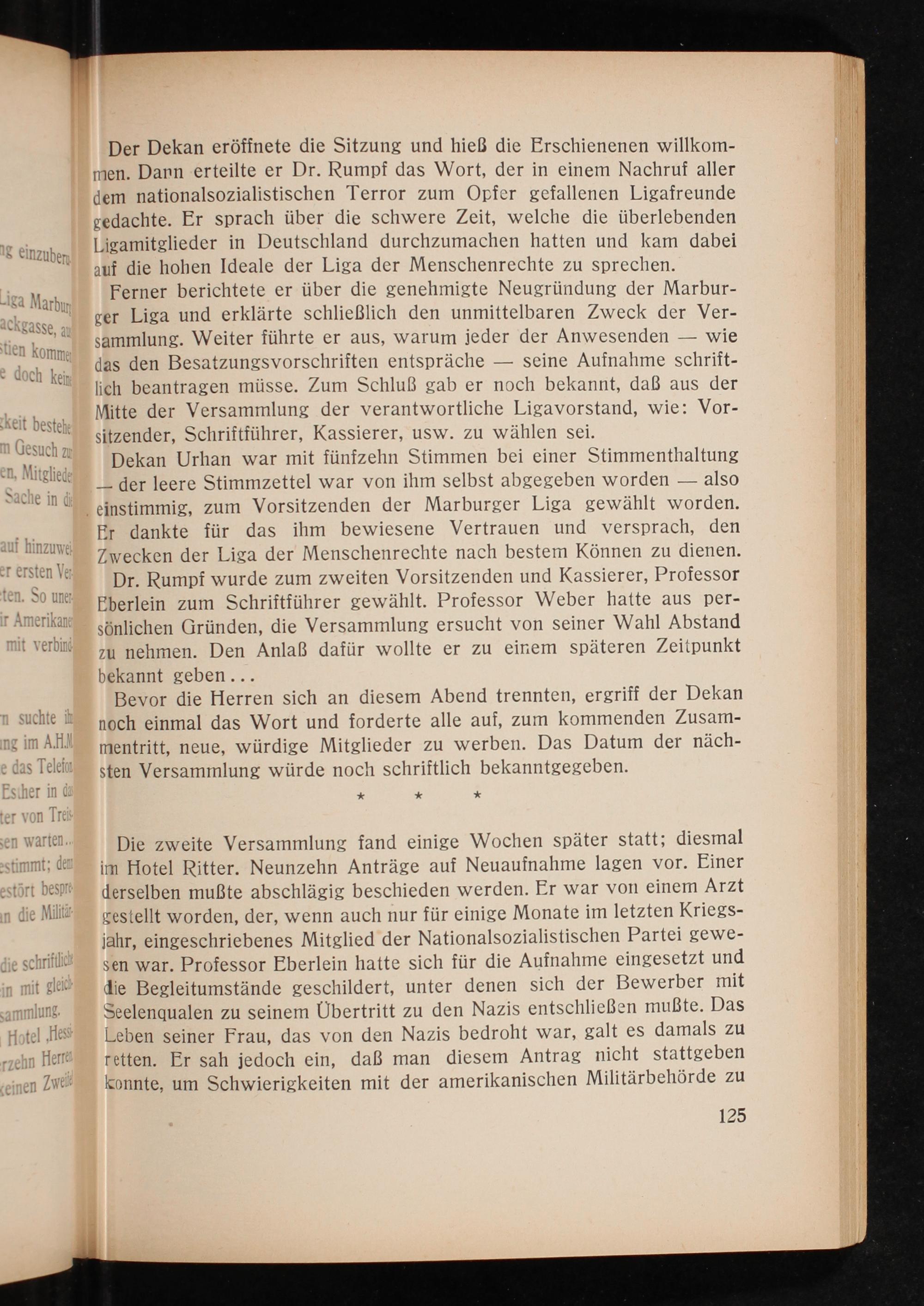 Die zweite Versammlung fand einige Wochen später statt; diesmal im Hotel Ritter. Neunzehn Anträge auf Neuaufnahme lagen vor. Einer derselben mußte abschlägig beschieden werden. Er war von einem Arzt sestellt worden, der, wenn auch nur für einige Monate im letzten Kriegs- jahr, eingeschriebenes Mitglied der Nationalsozialistischen Partei gewe- sen war. Professor Eberlein hatte sich für die Aufnahme eingesetzt und die Begleitumstände geschildert, unter denen sich der Bewerber mit Seelenqualen zu seinem Übertritt zu den Nazis entschließen mußte. Das Leben seiner Frau, das von den Nazis bedroht war, galt es damals zu retten. Er sah jedoch ein, daß man diesem Antrag nicht stattgeben Konnte, um Schwierigkeiten mit der amerikanischen Militärbehörde zu