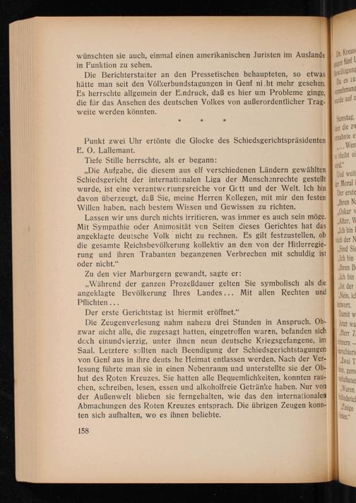 ,, Die Aufgabe, die diesem aus elf verschiedenen Ländern gewählten Schiedsgericht der internationalen Liga der Menschenrechte gestellt wurde, ist eine verantwortungsreiche vor Gott und der Welt. Ich bin davon überzeugt, daß Sie, meine Herren Kollegen, mit mir den festen Willen haben, nach bestem Wissen und Gewissen zu richten.