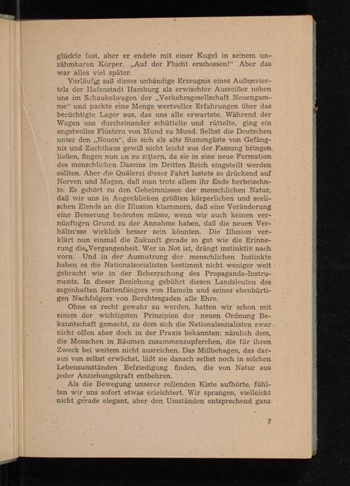 Ohne es recht gewahr zu werden, hatten wir schon mit einem der wichtigsten Prinzipien der neuen Ordnung Bekanntschaft gemacht, zu dem sich die Nationalsozialisten zwar nicht offen aber doch in der Praxis bekannten: nämlich dem, die Menschen in Räumen zusammenzupferchen, die für ihren Zweck bei weitem nicht ausreichen. Das Mißbehagen, das daraus von selbst erwächst, läßt sie danach selbst noch in solchen Lebensumständen Befriedigung finden, die von Natur aus jeder Anziehungskraft entbehren.
