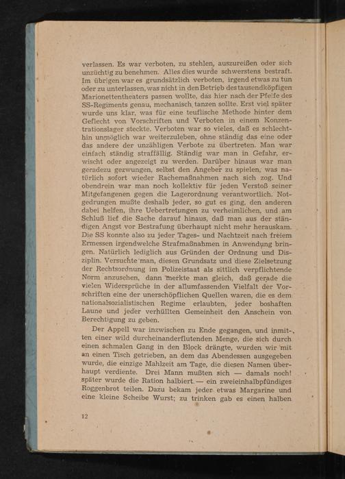 Der Appell war inzwischen zu Ende gegangen, und inmit-. ten einer wild durcheinanderflutenden Menge, die sich durch einen schmalen Gang in den Block drängte, wurden wir mit an einen Tisch getrieben, an dem das Abendessen ausgegeben wurde, die einzige Mahlzeit am Tage, die diesen Namen überhaupt verdiente. Drei Mann mußten sich damals noch! später wurde die Ration halbiert. ein zweieinhalbpfündiges Roggenbrot teilen. Dazu bekam jeder etwas Margarine und eine kleine Scheibe Wurst; zu trinken gab es einen halben