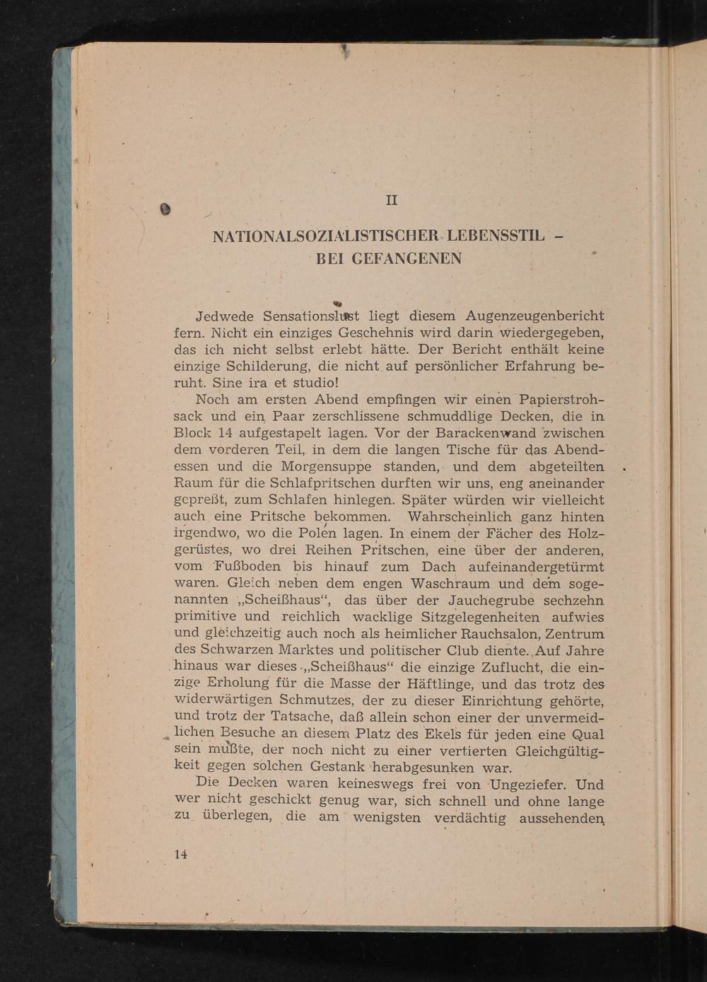 Noch am ersten Abend empfingen wir einen Papierstrohsack und ein Paar zerschlissene schmuddlige Decken, die in Block 14 aufgestapelt lagen. Vor der Barackenwand zwischen dem vorderen Teil, in dem die langen Tische für das Abendessen und die Morgensuppe standen, und dem abgeteilten Raum für die Schlafpritschen durften wir uns, eng aneinander gepreßt, zum Schlafen hinlegen. Später würden wir vielleicht auch eine Pritsche bekommen. Wahrscheinlich ganz hinten irgendwo, wo die Polen lagen. In einem der Fächer des Holzgerüstes, wo drei Reihen Pritschen, eine über der anderen, vom Fußboden bis hinauf zum Dach aufeinandergetürmt waren. Gleich neben dem engen Waschraum und dem sogenannten ,, Scheißhaus", das über der Jauchegrube sechzehn primitive und reichlich wacklige Sitzgelegenheiten aufwies und gleichzeitig auch noch als heimlicher Rauchsalon, Zentrum des Schwarzen Marktes und politischer Club diente. Auf Jahre hinaus war dieses. ,, Scheißhaus" die einzige Zuflucht, die einzige Erholung für die Masse der Häftlinge, und das trotz des widerwärtigen Schmutzes, der zu dieser Einrichtung gehörte, und trotz der Tatsache, daß allein schon einer der unvermeidlichen Besuche an diesem Platz des Ekels für jeden eine Qual sein mußte, der noch nicht zu einer vertierten Gleichgültigkeit gegen solchen Gestank herabgesunken war.