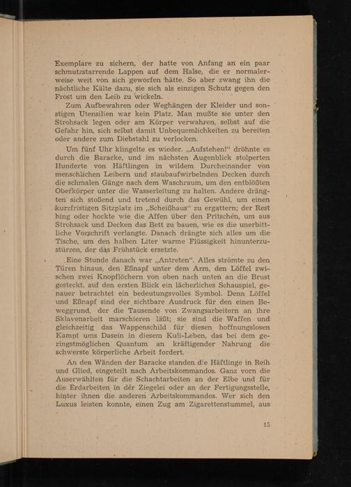 Eine Stunde danach war ,, Antreten". Alles strömte zu den Türen hinaus, den Eẞnapf unter dem Arm, den Löffel zwischen zwei Knopflöchern von oben nach unten an die Brust gesteckt, auf den ersten Blick ein lächerliches Schauspiel, genauer betrachtet ein bedeutungsvolles Symbol. Denn Löffel und Eẞnapf sind der sichtbare Ausdruck für den einen Beweggrund, der die Tausende von Zwangsarbeitern an ihre Sklavenarbeit marschieren läßt; sie sind die Waffen und gleichzeitig das Wappenschild für diesen hoffnungslosen Kampf ums Dasein in diesem Kuli- Leben, das bei dem geringstmöglichen Quantum an kräftigender Nahrung die schwerste körperliche Arbeit fordert.