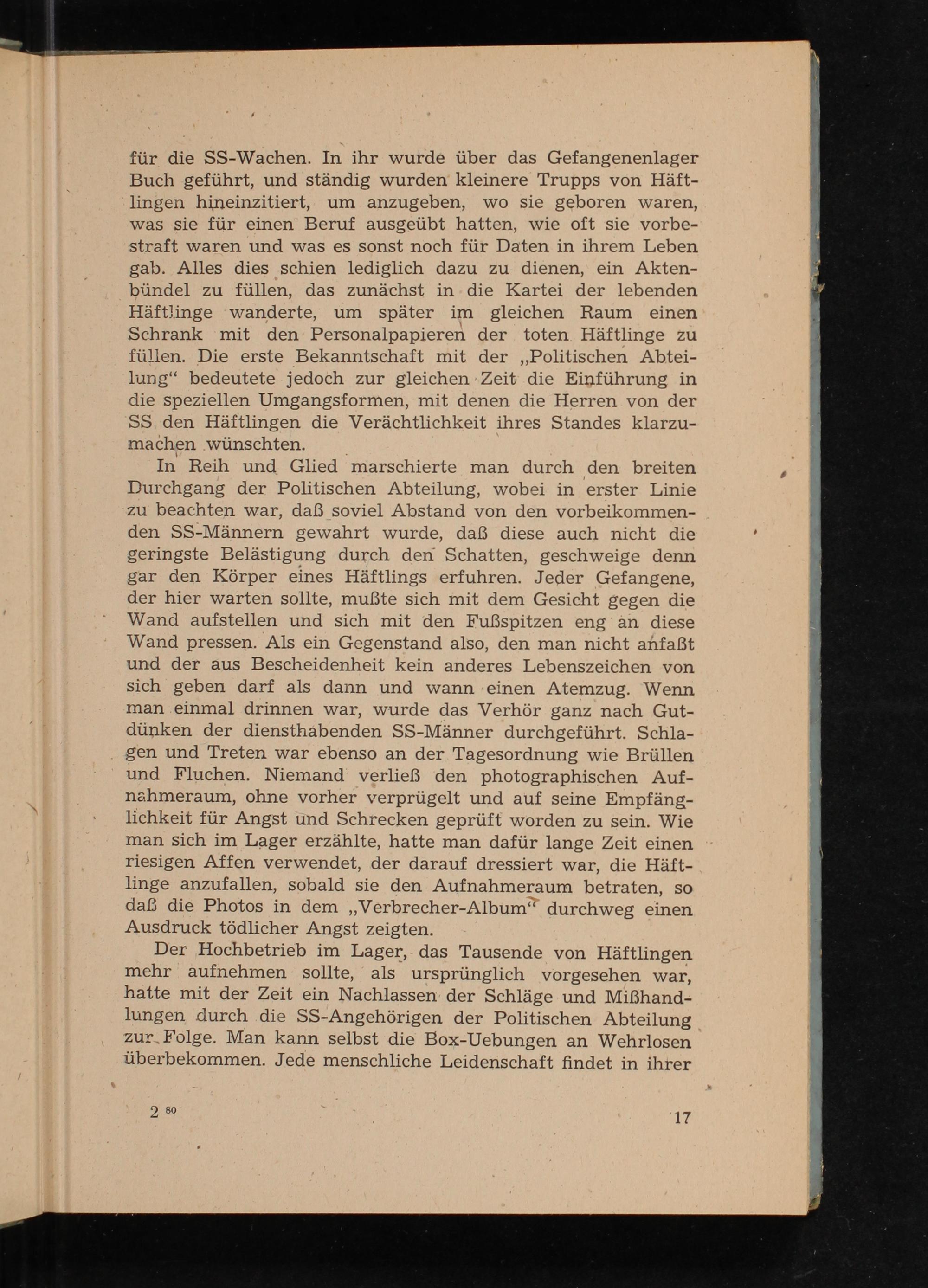 für die SS - Wachen. In ihr wurde über das Gefangenenlager Buch geführt, und ständig wurden kleinere Trupps von Häftlingen hineinzitiert, um anzugeben, wo sie geboren waren, was sie für einen Beruf ausgeübt hatten, wie oft sie vorbestraft waren und was es sonst noch für Daten in ihrem Leben gab. Alles dies schien lediglich dazu zu dienen, ein Aktenbündel zu füllen, das zunächst in die Kartei der lebenden Häftlinge wanderte, um später im gleichen Raum einen Schrank mit den Personalpapieren der toten Häftlinge zu füllen. Die erste Bekanntschaft mit der ,, Politischen Abteilung" bedeutete jedoch zur gleichen Zeit die Einführung in die speziellen Umgangsformen, mit denen die Herren von der SS den Häftlingen die Verächtlichkeit ihres Standes klarzumachen wünschten.
