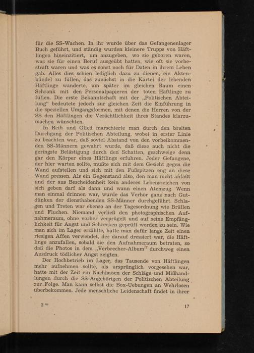In Reih und Glied marschierte man durch den breiten Durchgang der Politischen Abteilung, wobei in erster Linie zu beachten war, daß soviel Abstand von den vorbeikommenden SS - Männern gewahrt wurde, daß diese auch nicht die geringste Belästigung durch den Schatten, geschweige denn gar den Körper eines Häftlings erfuhren. Jeder Gefangene, der hier warten sollte, mußte sich mit dem Gesicht gegen die Wand aufstellen und sich mit den Fußspitzen eng an diese Wand pressen. Als ein Gegenstand also, den man nicht anfaẞt und der aus Bescheidenheit kein anderes Lebenszeichen von sich geben darf als dann und wann einen Atemzug. Wenn man einmal drinnen war, wurde das Verhör ganz nach Gutdünken der diensthabenden SS - Männer durchgeführt. Schlagen und Treten war ebenso an der Tagesordnung wie Brüllen und Fluchen. Niemand verließ den photographischen Aufnahmeraum, ohne vorher verprügelt und auf seine Empfänglichkeit für Angst und Schrecken geprüft worden zu sein. Wie man sich im Lager erzählte, hatte man dafür lange Zeit einen riesigen Affen verwendet, der darauf dressiert war, die Häftlinge anzufallen, sobald sie den Aufnahmeraum betraten, so daß die Photos in dem ,, Verbrecher- Album" durchweg einen Ausdruck tödlicher Angst zeigten.