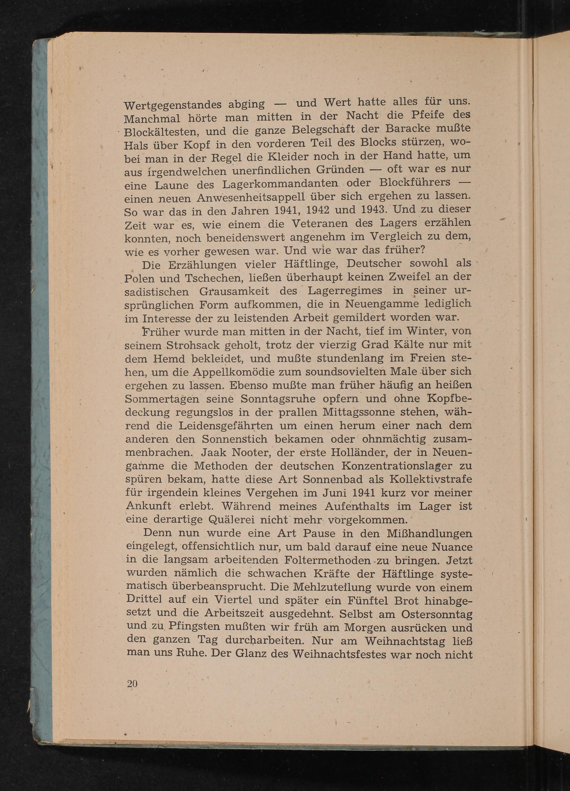 Früher wurde man mitten in der Nacht, tief im Winter, von seinem Strohsack geholt, trotz der vierzig Grad Kälte nur mit dem Hemd bekleidet, und mußte stundenlang im Freien ste- hen, um die Appellkomödie zum soundsovielten Male über sich ergehen zu lassen. Ebenso mußte man früher häufig an heißen Sommertagen seine Sonntagsruhe opfern und ohne Kopfbe- deckung regungslos in der prallen Mittagssonne stehen, wäh- rend die Leidensgefährten um einen herum einer nach dem anderen den Sonnenstich bekamen oder ohnmächtig zusam- menbrachen. Jaak Nooter, der erste Holländer, der in Neuen- gamme die Methoden der deutschen Konzentrationslager zu spüren bekam, hatte diese Art Sonnenbad als Kollektivstrafe für irgendein kleines Vergehen im Juni 1941 kurz vor meiner Ankunft erlebt. Während meines Aufenthalts im Lager ist eine derartige Quälerei nicht mehr: vorgekommen.