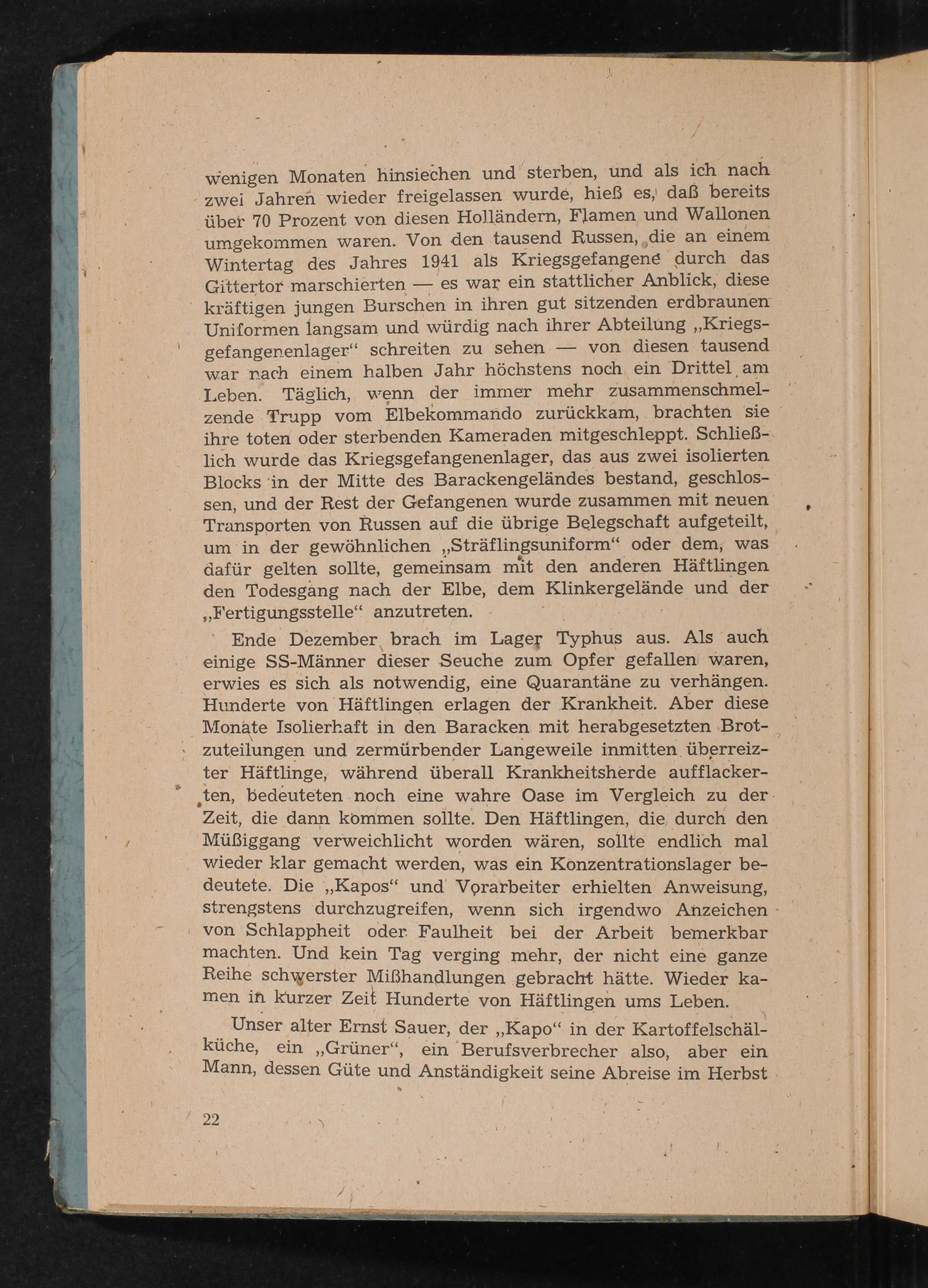 wenigen Monaten hinsiechen und sterben, und als ich nach zwei Jahren wieder freigelassen wurde, hieß es, daß bereits über 70 Prozent von diesen Holländern, Flamen und Wallonen umgekommen waren. Von den tausend Russen, die an einem Wintertag des Jahres 1941 als Kriegsgefangene durch das Gittertor marschierten es war ein stattlicher Anblick, diese kräftigen jungen Burschen in ihren gut sitzenden erdbraunen Uniformen langsam und würdig nach ihrer Abteilung ,, Kriegsgefangenenlager" schreiten zu sehen- von diesen tausend war nach einem halben Jahr höchstens noch ein Drittel am Leben. Täglich, wenn der immer mehr zusammenschmelzende Trupp vom Elbekommando zurückkam, brachten sie ihre toten oder sterbenden Kameraden mitgeschleppt. Schließlich wurde das Kriegsgefangenenlager, das aus zwei isolierten Blocks in der Mitte des Barackengeländes bestand, geschlossen, und der Rest der Gefangenen wurde zusammen mit neuen Transporten von Russen auf die übrige Belegschaft aufgeteilt, um in der gewöhnlichen ,, Sträflingsuniform" oder dem, was dafür gelten sollte, gemeinsam mit den anderen Häftlingen den Todesgang nach der Elbe, dem Klinkergelände und der ,, Fertigungsstelle" anzutreten.