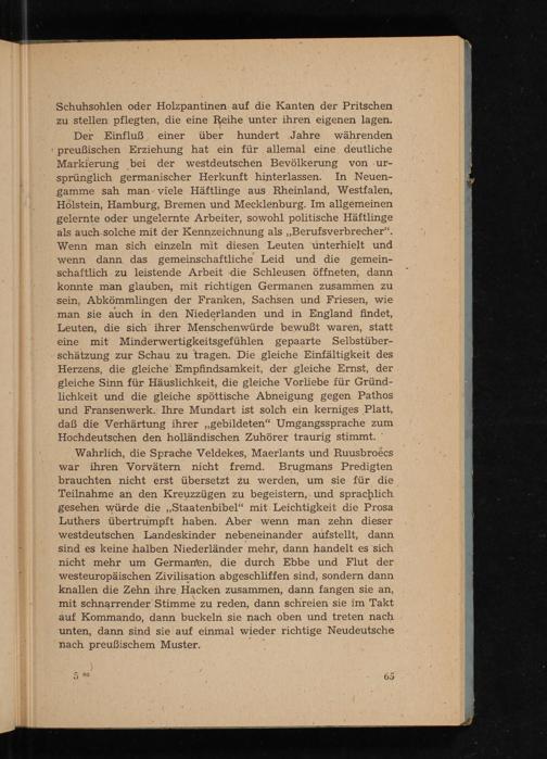 Wahrlich, die Sprache Veldekes, Maerlants und Ruusbroecs war ihren Vorvätern nicht fremd. Brugmans Predigten brauchten nicht erst übersetzt zu werden, um sie für die Teilnahme an den Kreuzzügen zu begeistern,. und sprachlich gesehen würde die„Staatenbibel“ mit. Leichtigkeit die Prosa Luthers übertrumpft haben. Aber wenn man zehn dieser westdeutschen Landeskinder nebeneinander aufstellt, dann sind es keine halben Niederländer mehr, dann handelt es sich nicht mehr um Germanen, die durch Ebbe und Flut der westeuropäischen Zivilisation abgeschliffen sind, sondern dann knallen die Zehn ihre Hacken zusammen, dann fangen sie an, mit schnarrender Stimme zu reden, dann schreien sie im Takt auf Kommando, dann buckeln sie nach oben und treten nach unten, dann sind sie auf einmal wieder richtige Neudeutsche nach preußischem Muster. i