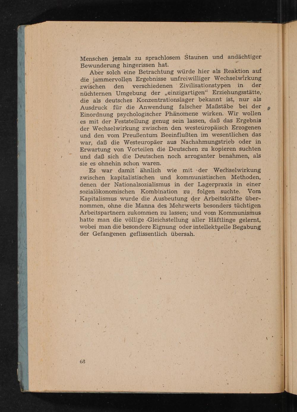 Aber solch eine Betrachtung würde hier als Reaktion auf die jammervollen Ergebnisse unfreiwilliger Wechselwirkung zwischen den verschiedenen Zivilisationstypen in nüchternen Umgebung der„ einzigartigen" Erziehungsstätte, die als deutsches Konzentrationslager bekannt ist, nur als Ausdruck für die Anwendung falscher Maßstäbe bei der Einordnung psychologischer Phänomene wirken. Wir wollen es mit der Feststellung genug sein lassen, daß das Ergebnis der Wechselwirkung zwischen den westeuropäisch Erzogenen und den vom Preußentum Beeinflußten im wesentlichen das war, daß die Westeuropäer aus Nachahmungstrieb oder in Erwartung von Vorteilen die Deutschen zu kopieren suchten und daß sich die Deutschen noch arroganter benahmen, als sie es ohnehin schon waren.