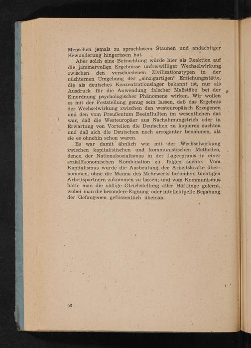 Es war damit ähnlich wie mit der Wechselwirkung zwischen kapitalistischen und kommunistischen Methoden, denen der Nationalsozialismus in der Lagerpraxis in einer sozialökonomischen Kombination zu, folgen suchte. Vom Kapitalismus wurde die Ausbeutung der Arbeitskräfte übernommen, ohne die Manna des Mehrwerts besonders tüchtigen Arbeitspartnern zukommen zu lassen; und vom Kommunismus hatte man die völlige Gleichstellung aller Häftlinge gelernt, wobei man die besondere Eignung oder intellektuelle Begabung der Gefangenen geflissentlich übersah.
