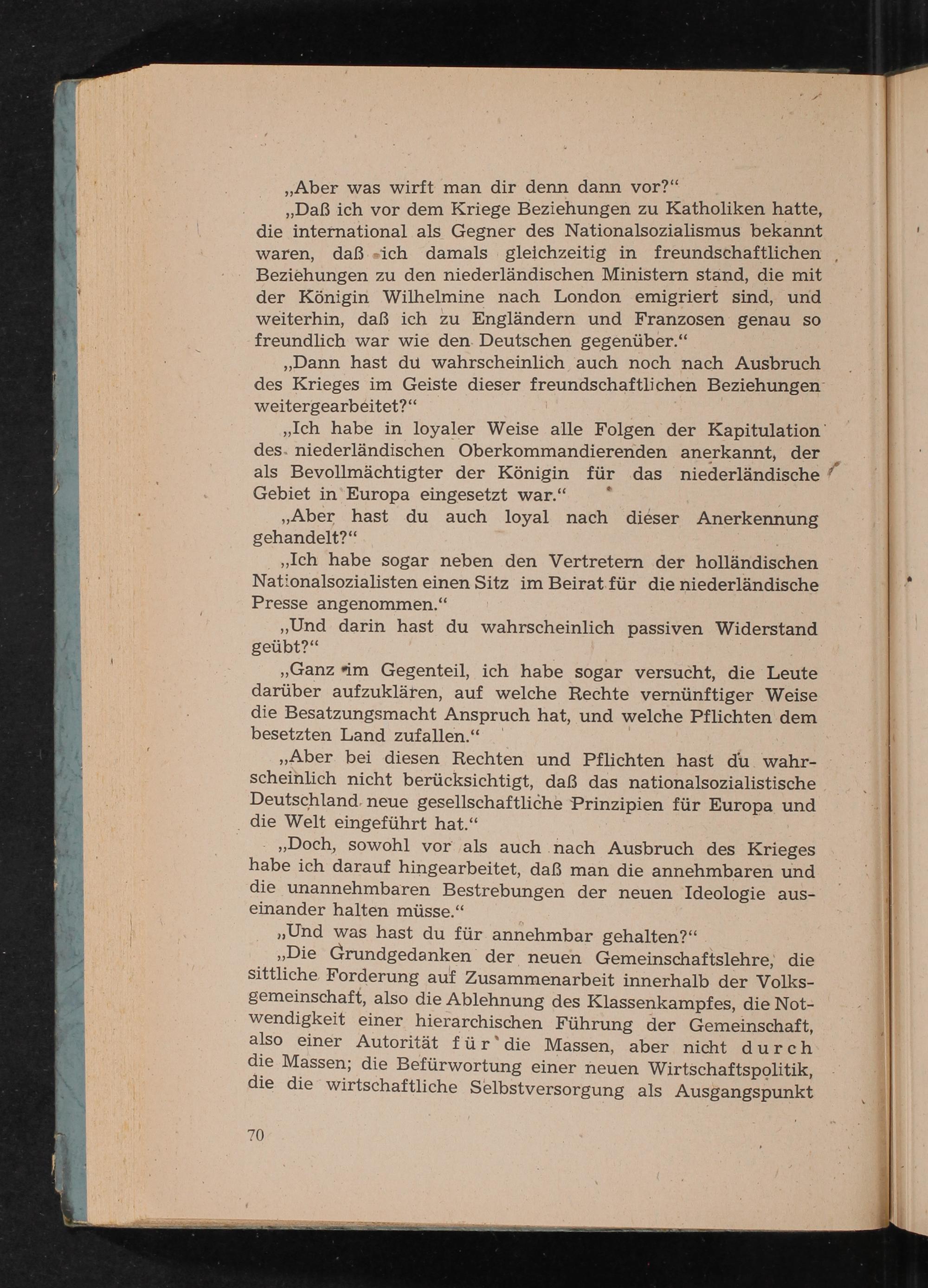 ,, Daß ich vor dem Kriege Beziehungen zu Katholiken hatte, die international als Gegner des Nationalsozialismus bekannt waren, daß ich damals gleichzeitig in freundschaftlichen Beziehungen zu den niederländischen Ministern stand, die mit der Königin Wilhelmine nach London emigriert sind, und weiterhin, daß ich zu Engländern und Franzosen genau so freundlich war wie den Deutschen gegenüber."