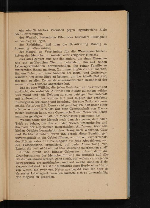 Das ist eine Willkür, die jeden Gedanken an Persönlichkeit auslöscht, die ordnende Autorität im Staate zu einem wilden Tier macht und jede Neigung zu einer geistigen Gemeinschaft mit anderen sinnlos werden läßt und folglich das erhabene Kulturgut in Erziehung und Berufung, das eine Nation erst ausmacht, absterben läßt. Denn es ist ganz logisch, daß unter einer solchen Willkürherrschaft nur eine Gemeinschaft von Marionetten bestehen kann, eine Gemeinschaft von Menschen, denen man den geistigen Inhalt des Menschseins genommen hat.
