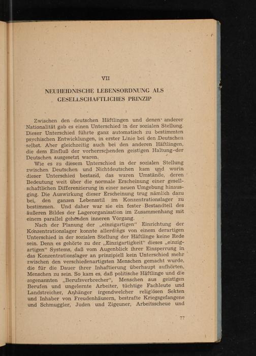 Zwischen den-deutschen Häftlingen und denen‘ anderer Nationalität gab es einen Unterschied in der sozialen Stellung. Dieser Unterschied führte ganz automatisch zu bestimmten psychischen Entwicklungen, in erster Linie bei den Deutschen selbst. Aber gleichzeitig auch bei den anderen Häftlingen, die dem Einfluß der vorherrschenden geistigen Haltung-der Deutschen Ausgesetzt waren. A