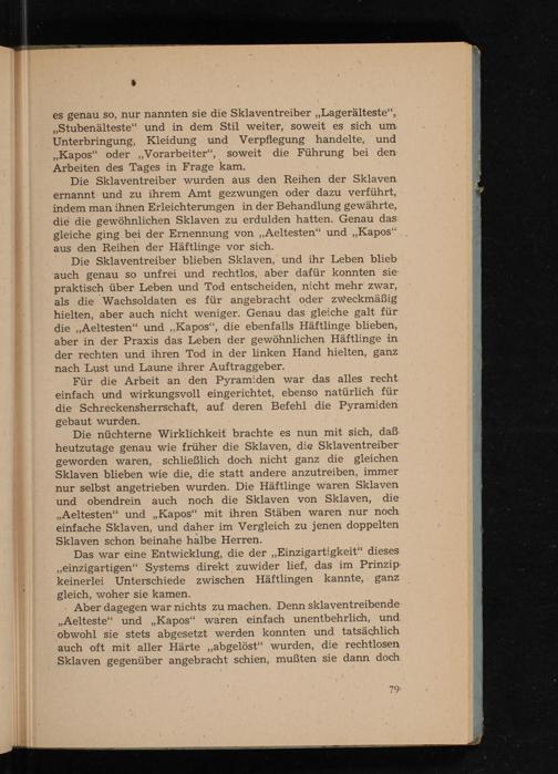 es genau so, nur nannten sie die Sklaventreiber„Lagerälteste‘“, „Stubenälteste“ und in dem Stil weiter, soweit es sich um Unterbringung, Kleidung und Verpflegung. handelte, und „Kapos“ oder„Vorarbeiter“, soweit die Führung bei den Arbeiten des Tages in Frage kam.