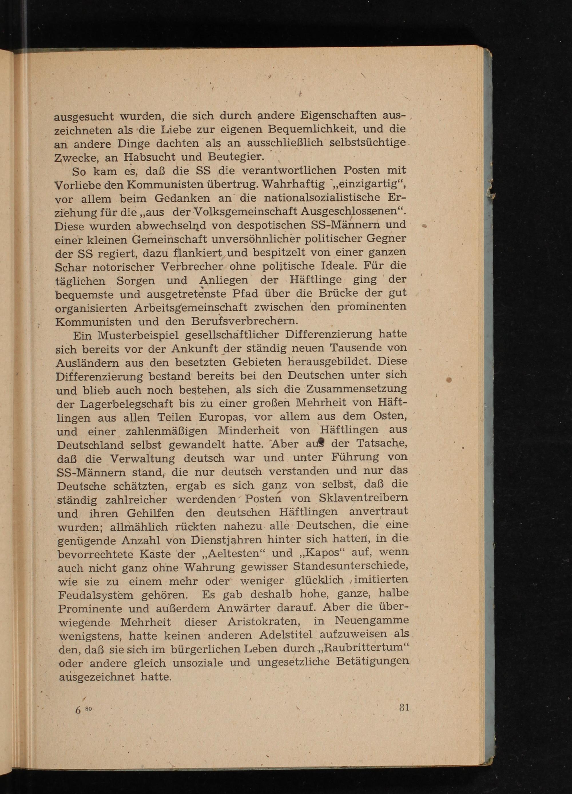 Ein Musterbeispiel gesellschaftlicher Differenzierung hatte sich bereits vor der Ankunft der ständig neuen Tausende von Ausländern aus den besetzten Gebieten herausgebildet. Diese Differenzierung bestand bereits bei den Deutschen unter sich und blieb auch noch bestehen, als sich die Zusammensetzung der Lagerbelegschaft bis zu einer großen Mehrheit von Häftlingen aus allen Teilen Europas , vor allem aus dem Osten, und einer zahlenmäßigen Minderheit von Häftlingen aus Deutschland selbst gewandelt hatte. Aber aus der Tatsache, daß die Verwaltung deutsch war und unter Führung von SS - Männern stand, die nur deutsch verstanden und nur das Deutsche schätzten, ergab es sich ganz von selbst, daß die ständig zahlreicher werdenden Posten von Sklaventreibern und ihren Gehilfen den deutschen Häftlingen anvertraut wurden; allmählich rückten nahezu alle Deutschen , die eine genügende Anzahl von Dienstjahren hinter sich hatten, in die bevorrechtete Kaste der ,, Aeltesten" und ,, Kapos" auf, wenn auch nicht ganz ohne Wahrung gewisser Standesunterschiede, wie sie zu einem mehr oder weniger glücklich imitierten Feudalsystem gehören. Es gab deshalb hohe, ganze, halbe Prominente und außerdem Anwärter darauf. Aber die überwiegende Mehrheit dieser Aristokraten, in Neuengamme wenigstens, hatte keinen anderen Adelstitel aufzuweisen als den, daß sie sich im bürgerlichen Leben durch ,, Raubrittertum " oder andere gleich unsoziale und ungesetzliche Betätigungen ausgezeichnet hatte.