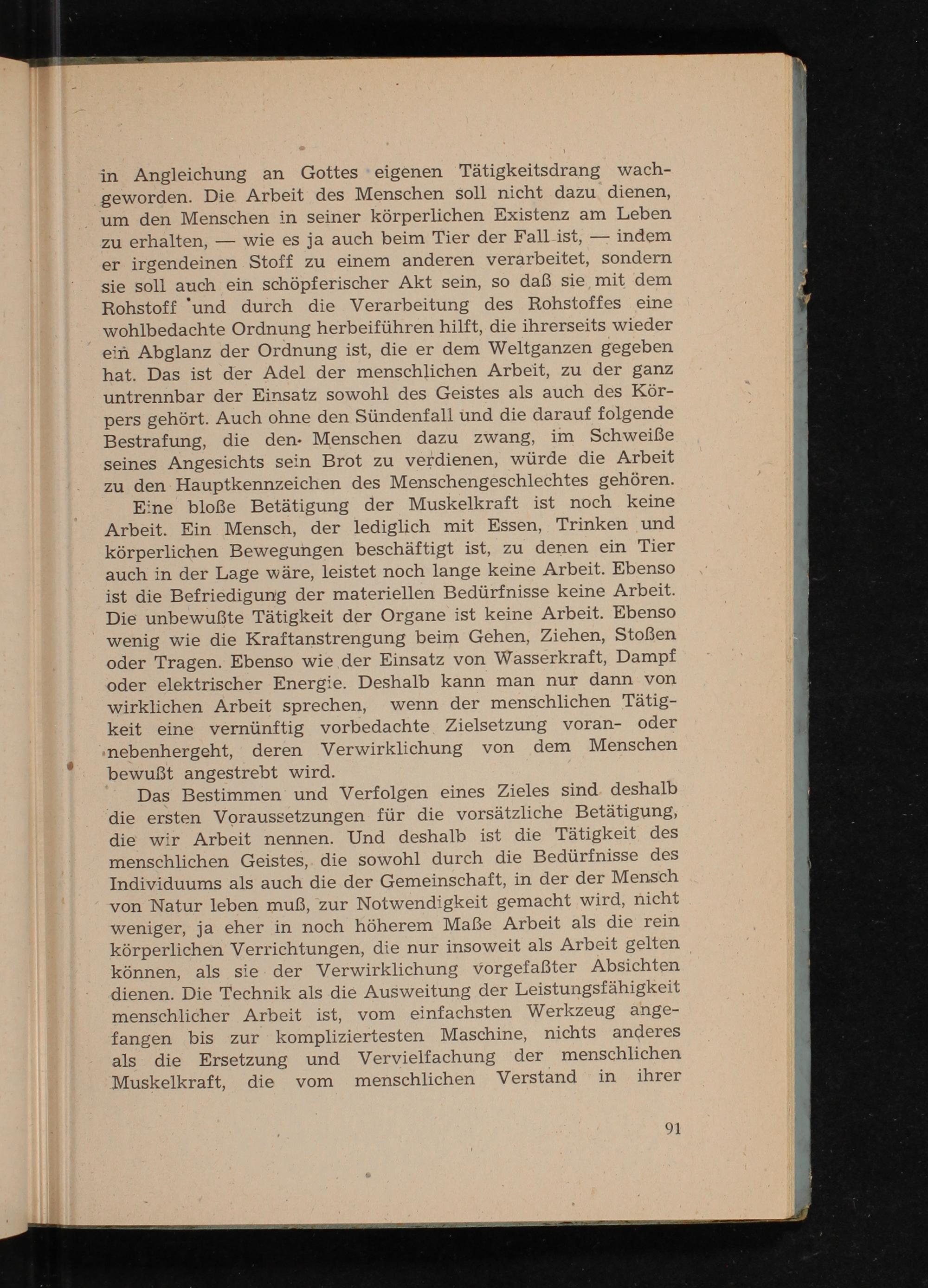 in Angleichung an Gottes eigenen Tätigkeitsdrang wachgeworden. Die Arbeit des Menschen soll nicht dazu dienen, um den Menschen in seiner körperlichen Existenz am Leben indem zu erhalten, wie es ja auch beim Tier der Fall ist, er irgendeinen Stoff zu einem anderen verarbeitet, sondern sie soll auch ein schöpferischer Akt sein, so daß sie mit dem Rohstoff und durch die Verarbeitung des Rohstoffes eine wohlbedachte Ordnung herbeiführen hilft, die ihrerseits wieder ein Abglanz der Ordnung ist, die er dem Weltganzen gegeben hat. Das ist der Adel der menschlichen Arbeit, zu der ganz untrennbar der Einsatz sowohl des Geistes als auch des Körpers gehört. Auch ohne den Sündenfall und die darauf folgende Bestrafung, die den Menschen dazu zwang, im Schweiße seines Angesichts sein Brot zu verdienen, würde die Arbeit zu den Hauptkennzeichen des Menschengeschlechtes gehören.