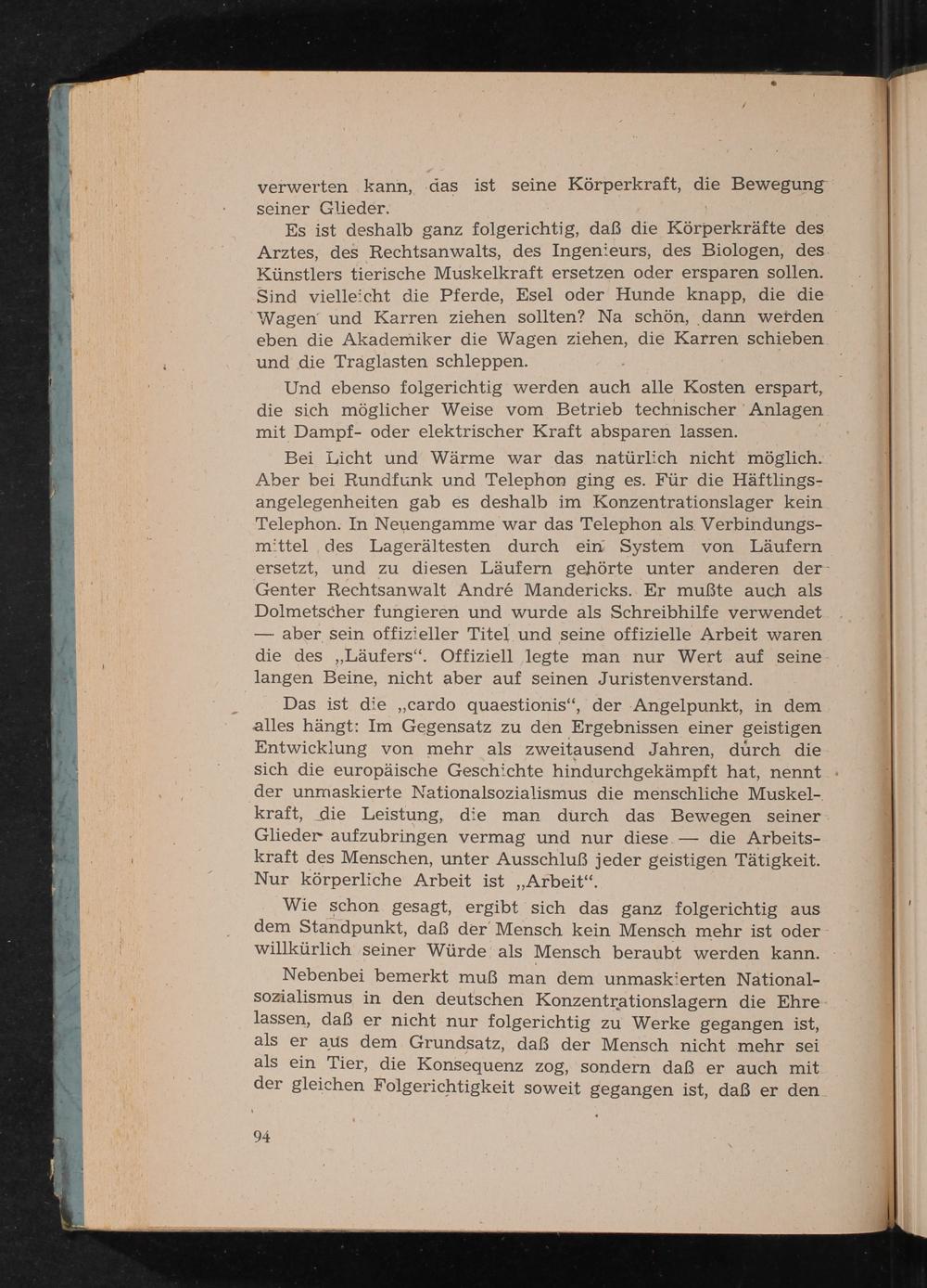 Bei Licht und Wärme war das natürlich nicht möglich. Aber bei Rundfunk und Telephon ging es. Für die Häftlingsangelegenheiten gab es deshalb im Konzentrationslager kein Telephon. In Neuengamme war das Telephon als Verbindungsmittel des Lagerältesten durch ein System von Läufern ersetzt, und zu diesen Läufern gehörte unter anderen der Genter Rechtsanwalt André Mandericks. Er mußte auch als Dolmetscher fungieren und wurde als Schreibhilfe verwendet aber sein offizieller Titel und seine offizielle Arbeit waren die des ,, Läufers". Offiziell legte man nur Wert auf seine langen Beine, nicht aber auf seinen Juristenverstand.