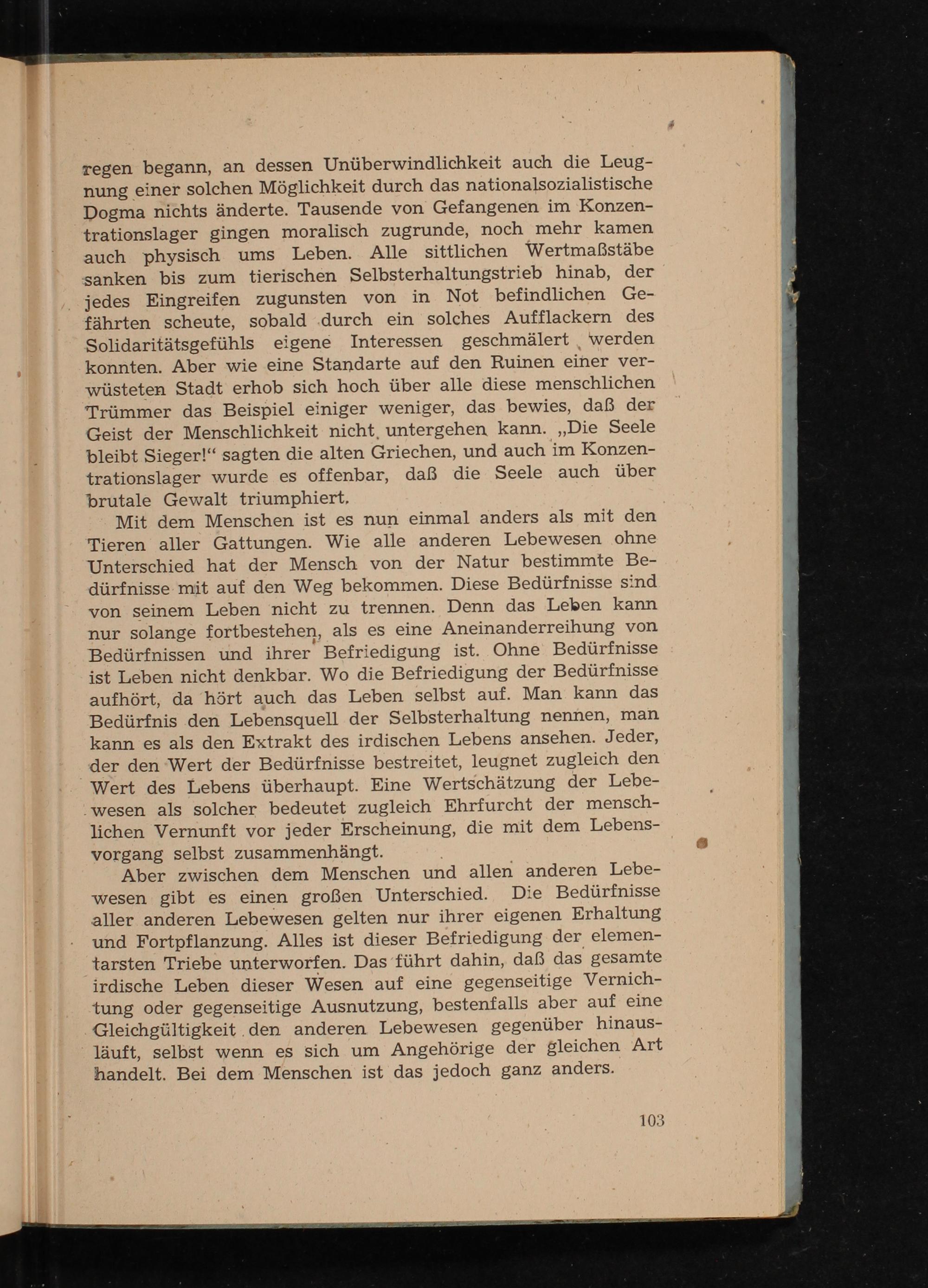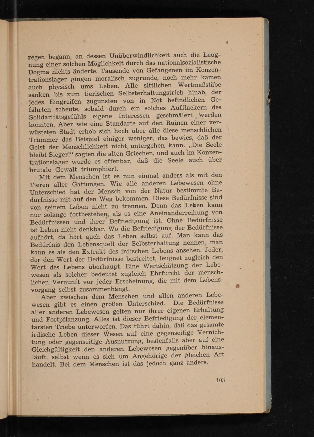 regen begann, an dessen Unüberwindlichkeit auch die Leugnung einer solchen Möglichkeit durch das nationalsozialistische Dogma nichts änderte. Tausende von Gefangenen im Konzentrationslager gingen moralisch zugrunde, noch mehr kamen auch physisch ums Leben. Alle sittlichen Wertmaßstäbe sanken bis zum tierischen Selbsterhaltungstrieb hinab, der jedes Eingreifen zugunsten von in Not befindlichen Gefährten scheute, sobald durch ein solches Aufflackern des Solidaritätsgefühls eigene Interessen geschmälert werden konnten. Aber wie eine Standarte auf den Ruinen einer verwüsteten Stadt erhob sich hoch über alle diese menschlichen Trümmer das Beispiel einiger weniger, das bewies, daß der Geist der Menschlichkeit nicht, untergehen kann. ,, Die Seele bleibt Sieger!" sagten die alten Griechen, und auch im Konzentrationslager wurde es offenbar, daß die Seele auch über brutale Gewalt triumphiert,