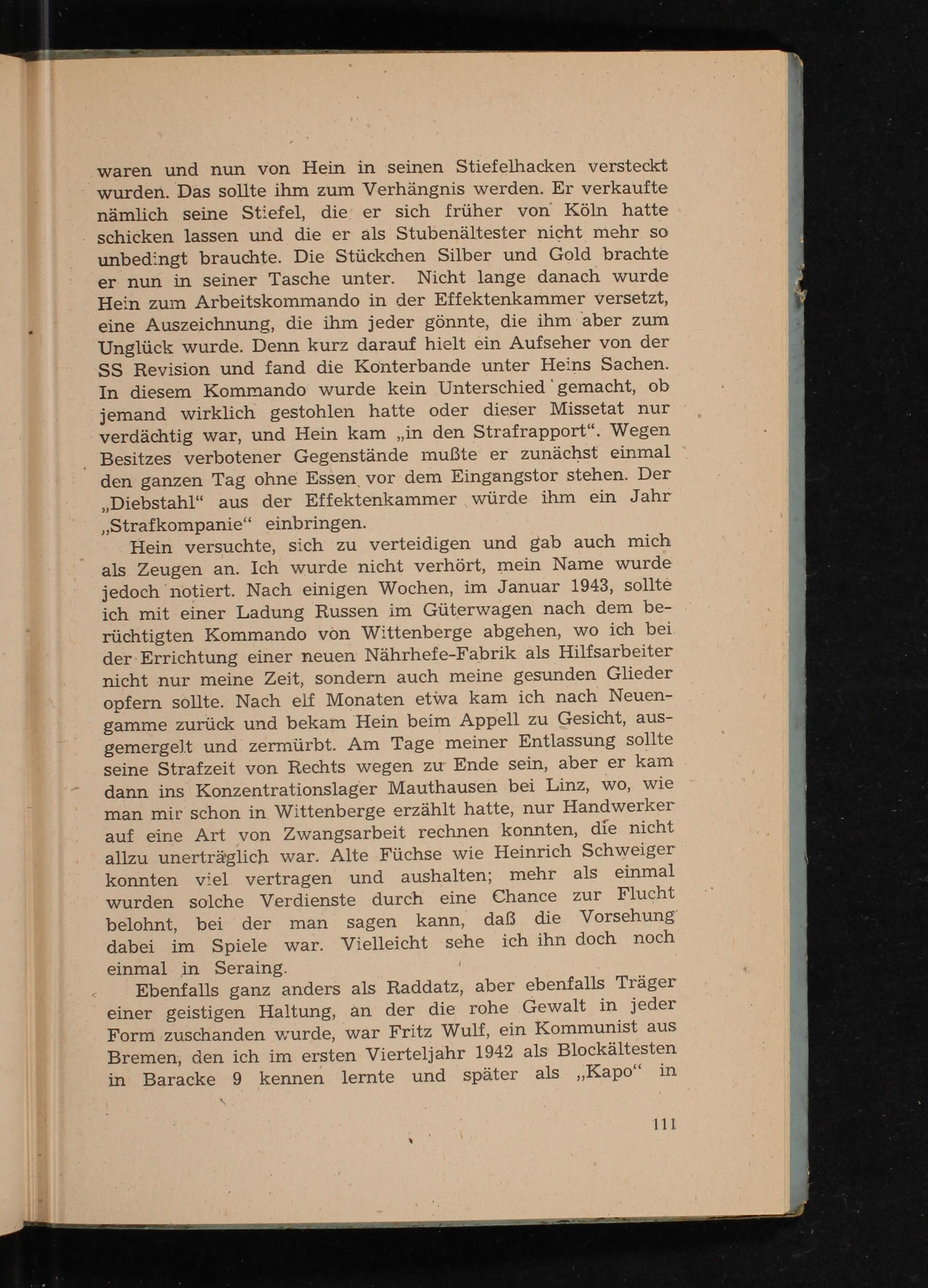 waren und nun von Hein in seinen Stiefelhacken versteckt wurden. Das sollte ihm zum Verhängnis werden. Er verkaufte nämlich seine Stiefel, die er sich früher von Köln hatte schicken lassen und die er als Stubenältester nicht mehr so unbedingt brauchte. Die Stückchen Silber und Gold brachte er nun in seiner Tasche unter. Nicht lange danach wurde Hein zum Arbeitskommando in der Effektenkammer versetzt, eine Auszeichnung, die ihm jeder gönnte, die ihm aber zum Unglück wurde. Denn kurz darauf hielt ein Aufseher von der SS Revision und fand die Konterbande unter Heins Sachen. In diesem Kommando wurde kein Unterschied"gemacht, ob jemand wirklich gestohlen hatte oder dieser Missetat nur verdächtig war, und Hein kam„in den Strafrapport“. Wegen Besitzes verbotener Gegenstände mußte er zunächst einmal den ganzen Tag ohne Essen, vor dem Eingangstor stehen. Der „Diebstahl“ aus der Effektenkammer würde ihm ein Jahr „Strafkompanie“ einbringen.