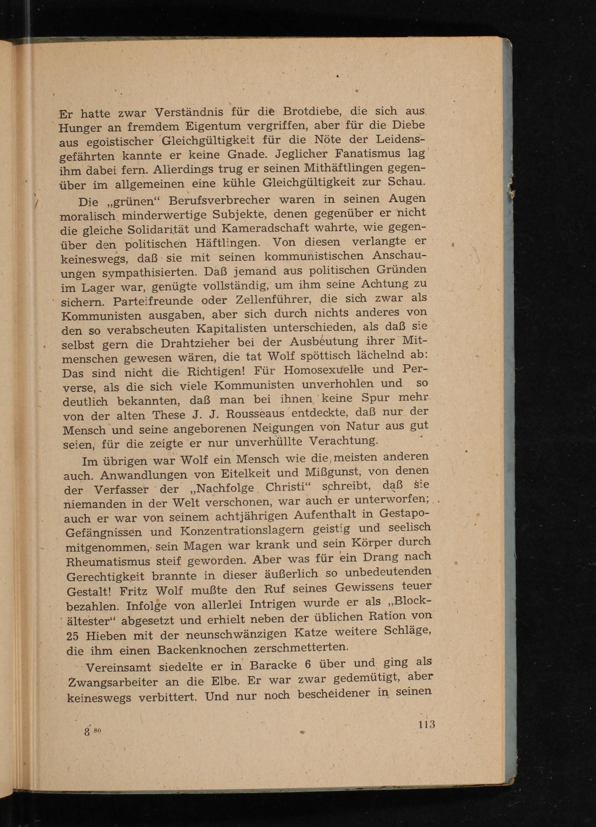 Die„grünen“ Berufsverbrecher waren in seinen Augen moralisch minderwertige Subjekte, denen gegenüber er nicht die gleiche Solidarität und Kameradschaft wahrte, wie gegen- über den politischen Häftlingen. Von diesen verlangte er keineswegs, daß‘ sie mit seinen kommunistischen Anschau- ungen sympathisierten. Daß jemand aus politischen Gründen im Lager war, genügte vollständig, um ihm seine Achtung zu sichern. Parteifreunde oder Zellenführer, die sich zwar als Kommunisten ausgaben, aber sich durch nichts anderes von den so verabscheuten Kapitalisten unterschieden, als daß sie selbst gern die Drahtzieher bei der Ausbeutung ihrer Mit- menschen gewesen wären, die tat Wolf spöttisch lächelnd ab: Das sind nicht die Richtigen! Für Homosexuelle und Per- verse, als die sich viele Kommunisten unverhohlen und so deutlich bekannten, daß man bei ihnen'keine Spur mehr von der alten These J. J. Rousseaus entdeckte, daß nur der Mensch und seine angeborenen Neigungen von Natur aus gut seien, für die zeigte er nur üunverhüllte Verachtung.}