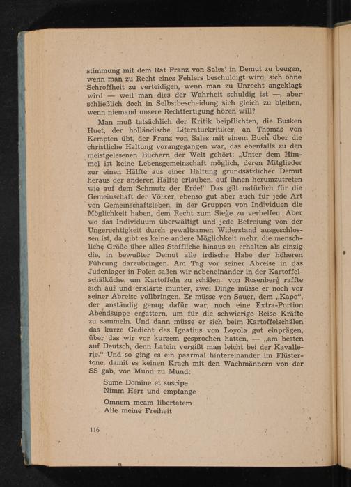 Man muß tatsächlich der Kritik beipflichten, die Busken Huet, der holländische Literaturkritiker, an Thomas von Kempten übt, der Franz von Sales mit einem Buch über die christliche Haltung vorangegangen war, das ebenfalls zu den meistgelesenen Büchern der Welt gehört:„ Unter dem Himmel ist keine Lebensgemeinschaft möglich, deren Mitglieder zur einen Hälfte aus einer Haltung grundsätzlicher Demut heraus der anderen Hälfte erlauben, auf ihnen herumzutreten wie auf dem Schmutz der Erde!" Das gilt natürlich für die Gemeinschaft der Völker, ebenso gut aber auch für jede Art von Gemeinschaftsleben, in der Gruppen von Individuen die Möglichkeit haben, dem Recht zum Siege zu verhelfen. Aber wo das Individuum überwältigt und jede Befreiung von der Ungerechtigkeit durch gewaltsamen Widerstand ausgeschlossen ist, da gibt es keine andere Möglichkeit mehr, die menschliche Größe über alles Stoffliche hinaus zu erhalten als einzig die, in bewußter Demut alle irdische Habe der höheren Führung darzubringen. Am Tag vor seiner Abreise in das Judenlager in Polen saßen wir nebeneinander in der Kartoffelschälküche, um Kartoffeln zu schälen. von Rosenberg raffte sich auf und erklärte munter, zwei Dinge müsse er noch vor seiner Abreise vollbringen. Er müsse von Sauer, dem ,, Kapo ", der anständig genug dafür war, noch eine Extra- Portion Abendsuppe ergattern, um für die schwierige Reise Kräfte zu sammeln. Und dann müsse er sich beim Kartoffelschälen das kurze Gedicht des Ignatius von Loyola gut einprägen, über das wir vor kurzem gesprochen hatten, ,, am besten auf Deutsch , denn Latein vergiẞt man leicht bei der Kavallerie." Und so ging es ein paarmal hintereinander im Flüstertone, damit es keinen Krach mit den Wachmännern von der SS gab, von Mund zu Mund: