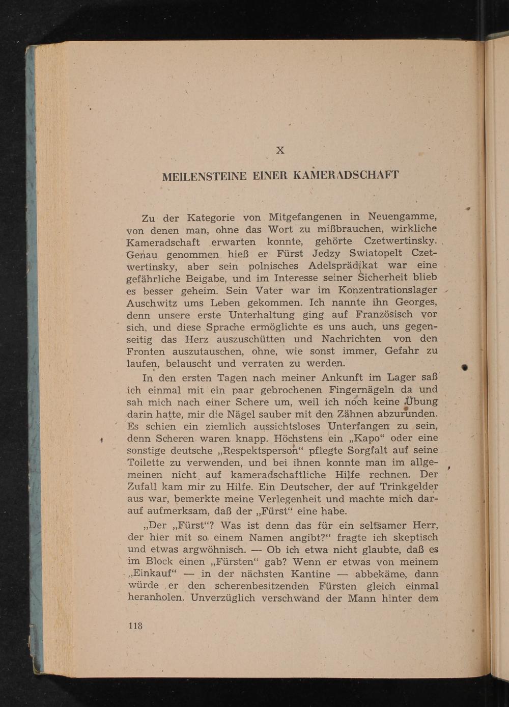 Zu der Kategorie von Mitgefangenen in Neuengamme , von denen man, ohne das Wort zu mißbrauchen, wirkliche Kameradschaft erwarten konnte, gehörte gehörte Czetwertinsky. Genau genommen hieß er Fürst Jedzy Swiatopelt Czetwertinsky, aber sein polnisches Adelsprädikat war eine gefährliche Beigabe, und im Interesse seiner Sicherheit blieb es besser geheim. Sein Vater war im Konzentrationslager Auschwitz ums Leben gekommen. Ich nannte ihn Georges, denn unsere erste Unterhaltung ging auf Französisch vor sich, und diese Sprache ermöglichte es uns auch, uns gegenseitig das Herz auszuschütten und Nachrichten von den Fronten auszutauschen, ohne, wie sonst immer, Gefahr zu laufen, belauscht und verraten zu werden.