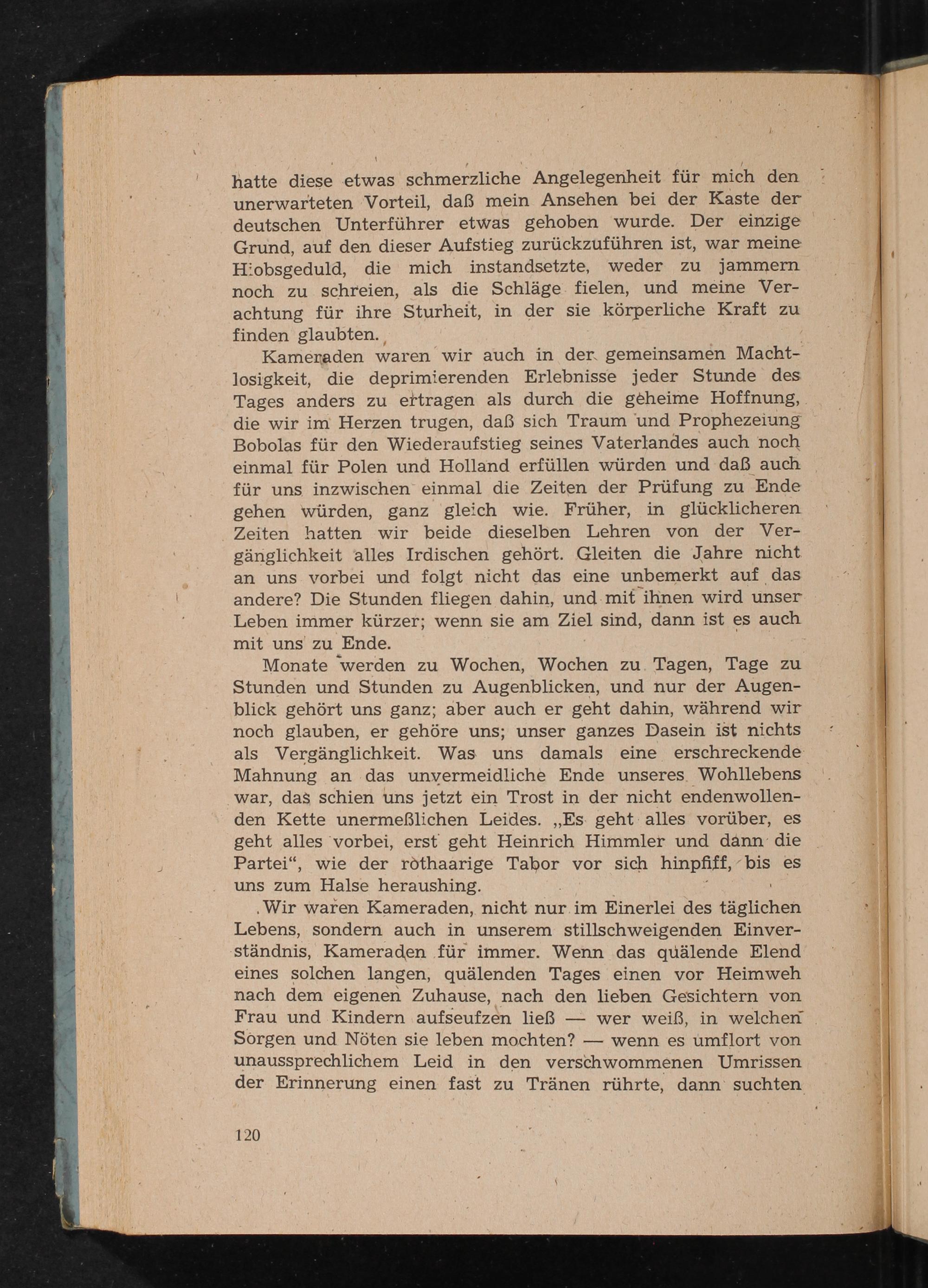 Monate werden zu Wochen, Wochen zu Tagen, Tage zu Stunden und Stunden zu Augenblicken, und nur der Augenblick gehört uns ganz; aber auch er geht dahin, während wir noch glauben, er gehöre uns; unser ganzes Dasein ist nichts als Vergänglichkeit. Was uns damals eine erschreckende Mahnung an das unvermeidliche Ende unseres Wohllebens war, das schien uns jetzt ein Trost in der nicht endenwollenden Kette unermeßlichen Leides.„ Es geht alles vorüber, es geht alles vorbei, erst geht Heinrich Himmler und dann die Partei", wie der rothaarige Tabor vor sich hinpfiff, bis es uns zum Halse heraushing.
