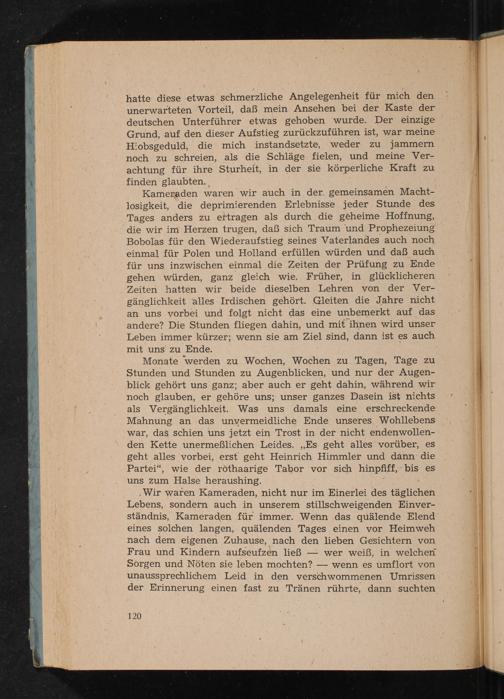 hatte diese etwas schmerzliche Angelegenheit für mich den unerwarteten Vorteil, daß mein Ansehen bei der Kaste der deutschen Unterführer etwas gehoben wurde. Der einzige Grund, auf den dieser Aufstieg zurückzuführen ist, war meine Hiobsgeduld, die mich instandsetzte, weder zu jammern noch zu schreien, als die Schläge fielen, und meine Verachtung für ihre Sturheit, in der sie körperliche Kraft zu finden glaubten.