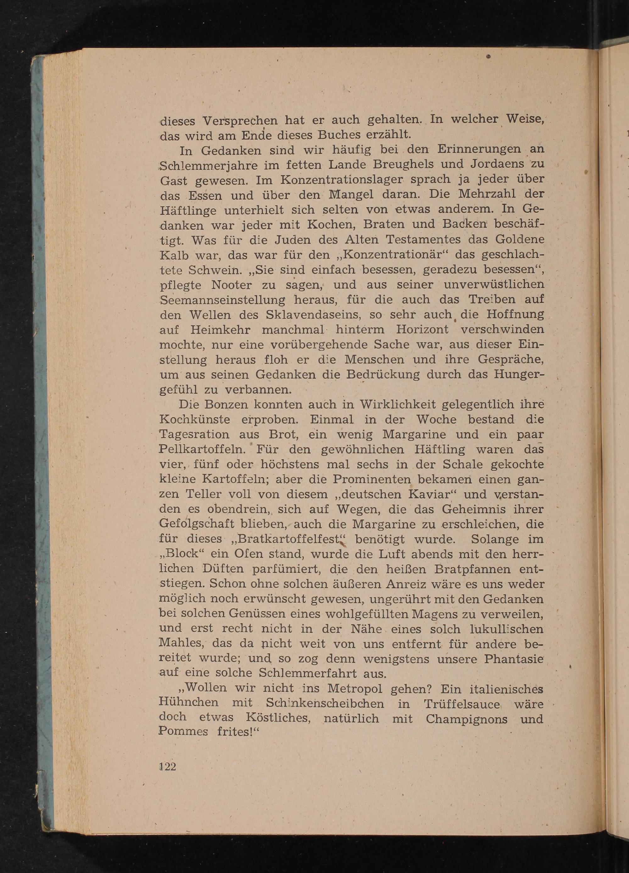 In Gedanken sind wir häufig bei den Erinnerungen an Schlemmerjahre im fetten Lande Breughels und Jordaens zu Gast gewesen. Im Konzentrationslager sprach ja jeder über das Essen und über den Mangel daran. Die Mehrzahl der Häftlinge unterhielt sich selten von etwas anderem. In Ge­danken war jeder mit Kochen, Braten und Backen beschäf­tigt. Was für die Juden des Alten Testamentes das Goldene Kalb war, das war für den ,, Konzentrationär" das geschlach­tete Schwein. ,, Sie sind einfach besessen, geradezu besessen", pflegte Nooter zu sagen, und aus seiner unverwüstlichen Seemannseinstellung heraus, für die auch das Treiben auf den Wellen des Sklavendaseins, so sehr auch die Hoffnung auf Heimkehr manchmal hinterm Horizont verschwinden mochte, nur eine vorübergehende Sache war, aus dieser Ein­stellung heraus floh er die Menschen und ihre Gespräche, um aus seinen Gedanken die Bedrückung durch das Hunger­gefühl zu verbannen.