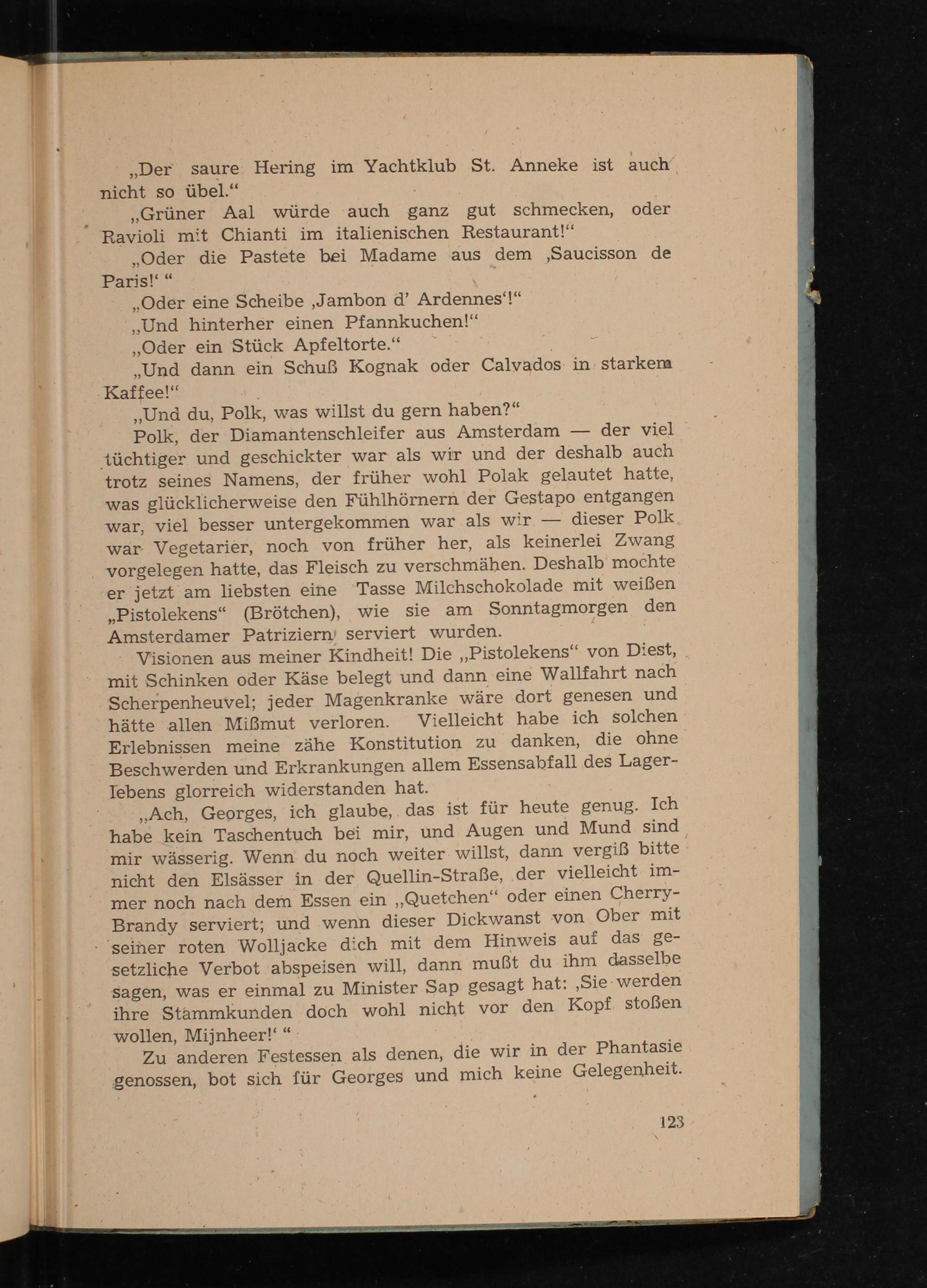 Polk, der Diamantenschleifer aus Amsterdam tüchtiger und geschickter war als wir und der deshalb auch trotz seines Namens, der früher wohl Polak gelautet hatte, was glücklicherweise den Fühlhörnern der Gestapo entgangen war, viel besser untergekommen war als wir dieser Polk, war Vegetarier, noch von früher her, als keinerlei Zwang vorgelegen hatte, das Fleisch zu verschmähen. Deshalb mochte er jetzt am liebsten eine Tasse Milchschokolade mit weißen ,, Pistolekens"( Brötchen), wie sie am Sonntagmorgen den Amsterdamer Patriziern serviert wurden.
