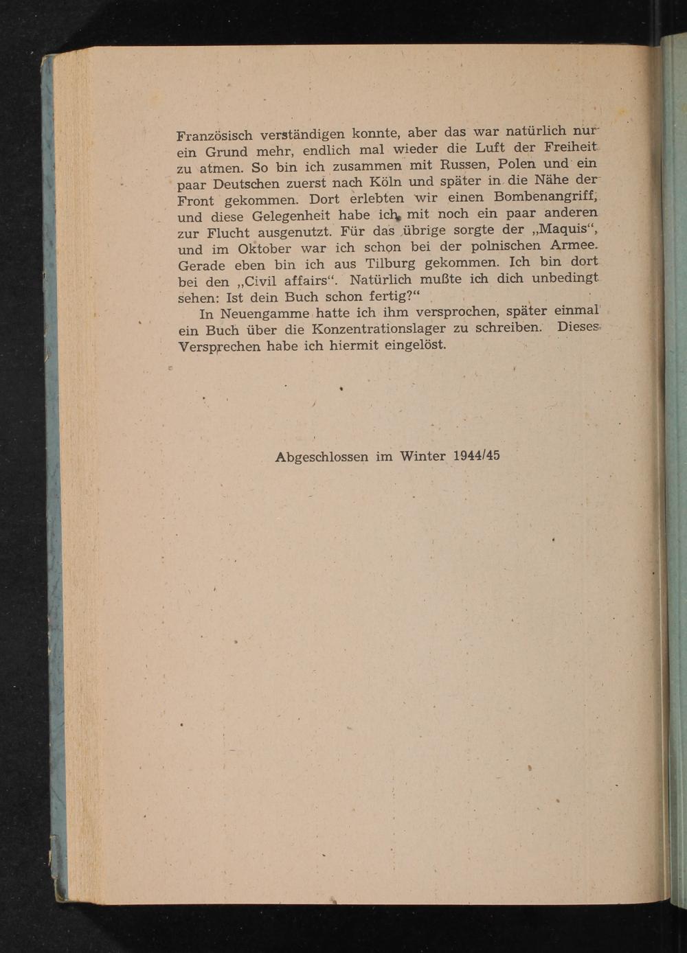 Französisch verständigen konnte, aber das war natürlich nur ein Grund mehr, endlich mal wieder die Luft der Freiheit zu atmen. So bin ich zusammen mit Russen, Polen und ein paar Deutschen zuerst nach Köln und später in die Nähe der Front gekommen. Dort erlebten wir einen Bombenangriff, und diese Gelegenheit habe ich mit noch ein paar anderen zur Flucht ausgenutzt. Für das übrige sorgte der ,, Maquis", und im Oktober war ich schon bei der polnischen Armee. Gerade eben bin ich aus Tilburg gekommen. Ich bin dort. bei den ,, Civil affairs". Natürlich mußte ich dich unbedingt sehen: Ist dein Buch schon fertig?"