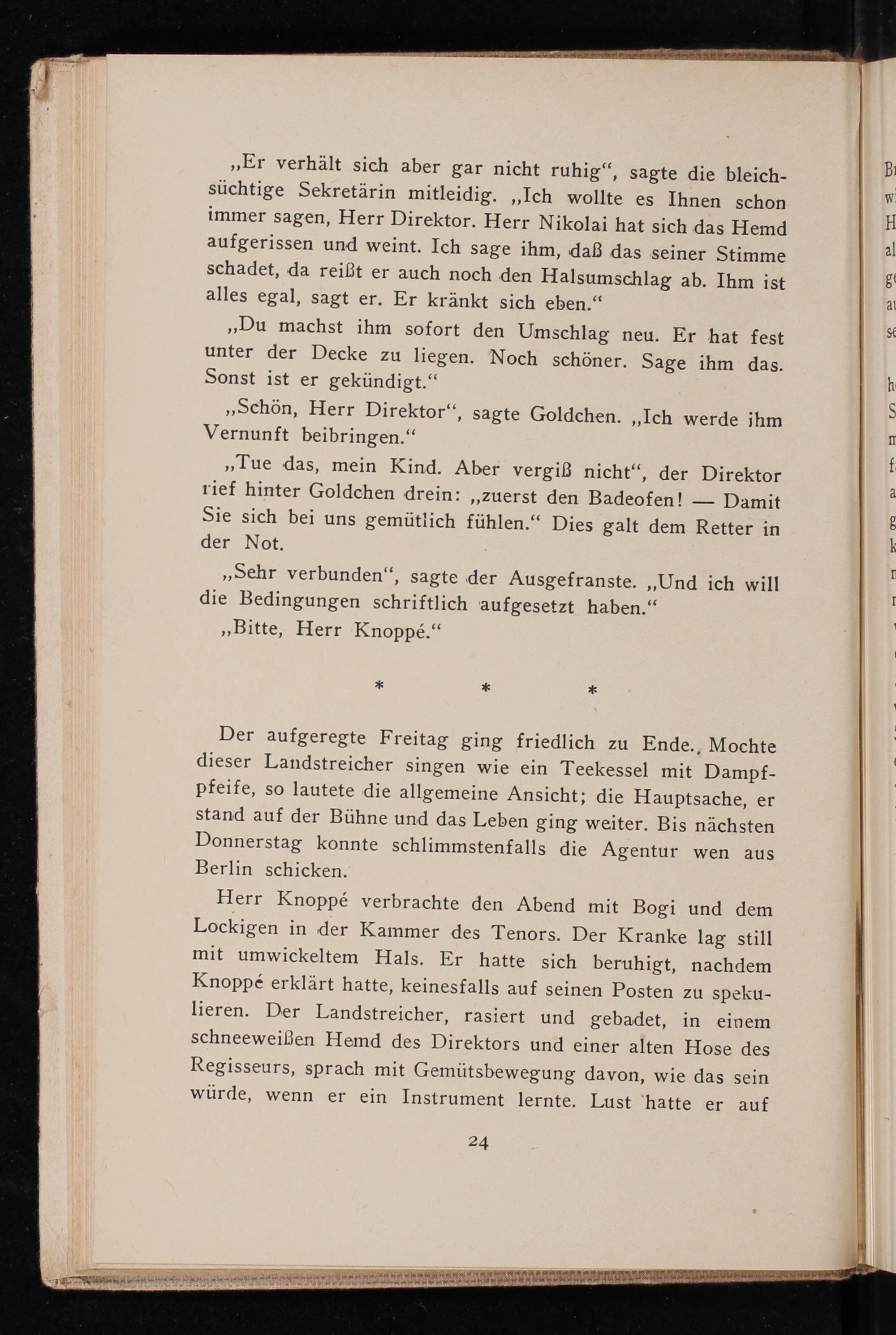 Herr Knoppé verbrachte den Abend mit Bogi und dem Lockigen in der Kammer des Tenors. Der Kranke lag still mit umwickeltem Hals. Er hatte sich beruhigt, nachdem Knoppé erklärt hatte, keinesfalls auf seinen Posten zu spekulieren. Der Landstreicher, rasiert und gebadet, in einem schneeweißen Hemd des Direktors und einer alten Hose des Regisseurs, sprach mit Gemütsbewegung davon, wie das sein würde, wenn er ein Instrument lernte. Lust hatte er auf