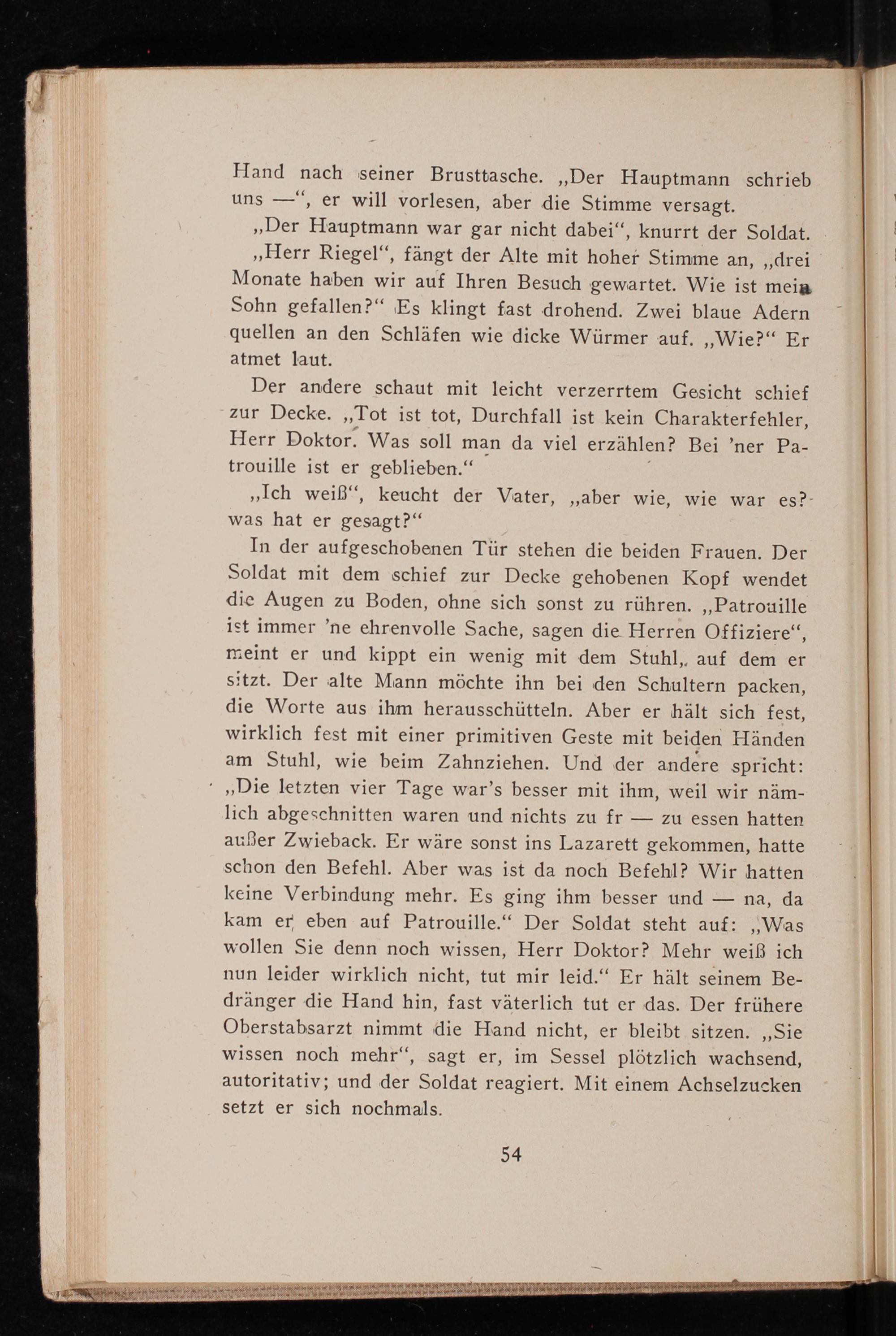 ,, Der Hauptmann war gar nicht dabei", knurrt der Soldat. ,, Herr Riegel", fängt der Alte mit hoher Stimme an ,,, drei Monate haben wir auf Ihren Besuch gewartet. Wie ist mein Sohn gefallen?" Es klingt fast drohend. Zwei blaue Adern quellen an den Schläfen wie dicke Würmer auf. ,, Wie?" Er atmet laut.