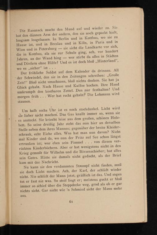 Der fröhliche Soldat auf dem Kalender da drinnen. All der Schwindel, den sie in den Zeitungen schreiben: ,, Große Zeit!" Bloß nicht umschauen, bloß nichts denken. Sie hat ja Glück gehabt. Nach Hause und Kaffee kochen. Ihre Hand umkrampft den kostbaren Zettel. Den nur festhalten! Und morgen früh... Wer hat recht gehabt? Die Lohmann wird
