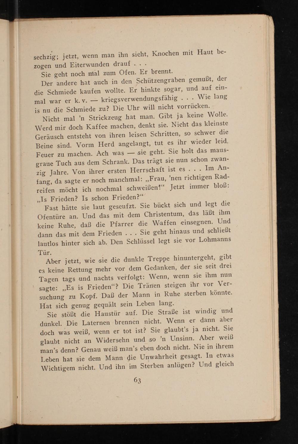 Aber jetzt, wie sie die dunkle Treppe hinuntergeht, gibt es keine Rettung mehr vor dem Gedanken, der sie seit drei Tagen tags und nachts verfolgt: Wenn, wenn sie ihm nun sagte: ,, Es is Frieden"? Die Tränen steigen ihr vor Versuchung zu Kopf. Daß der Mann in Ruhe sterben könnte. Hat sich genug gequält sein Leben lang.