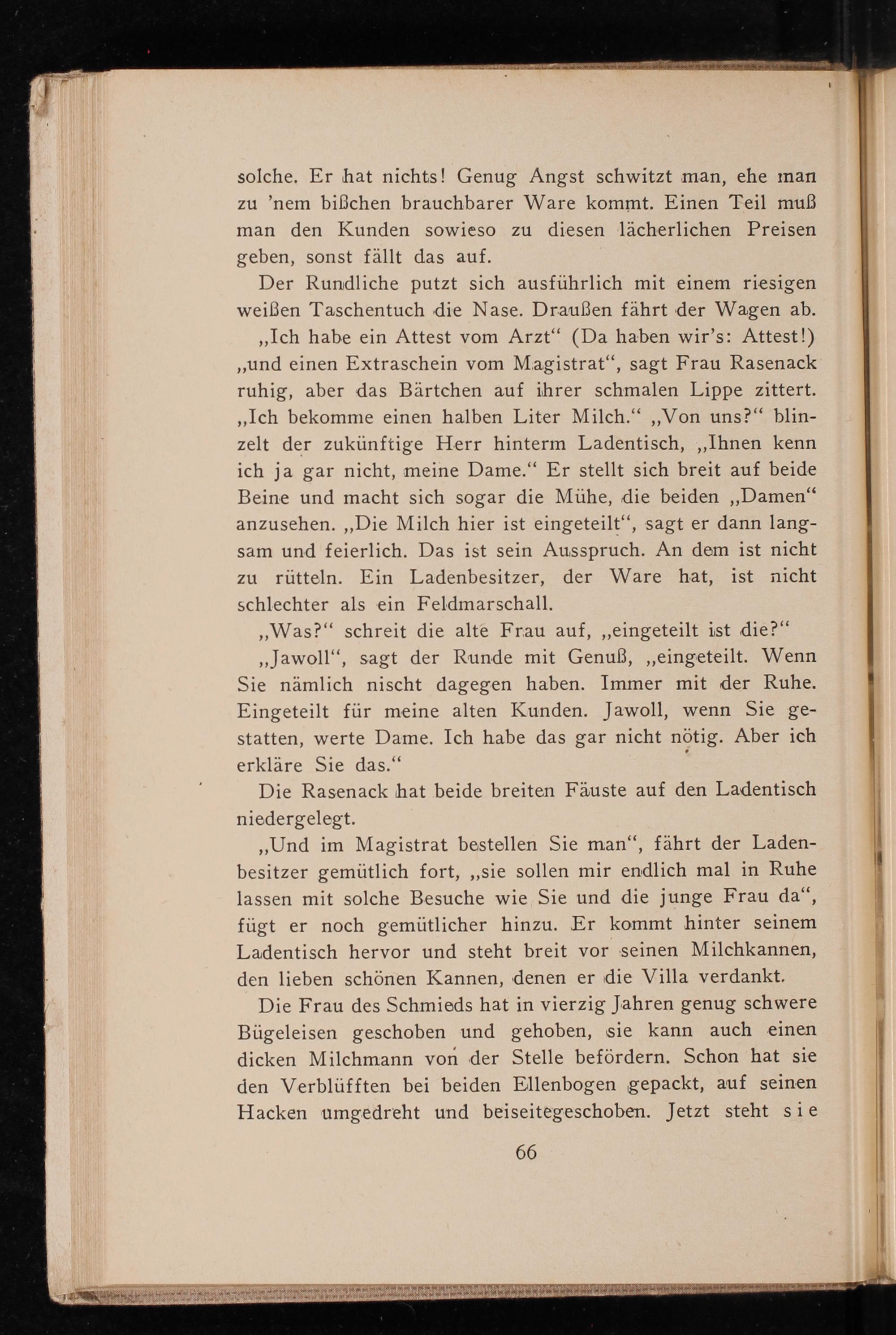 ,, Ich habe ein Attest vom Arzt"( Da haben wir's: Attest!) ,, und einen Extraschein vom Magistrat", sagt Frau Rasenack ruhig, aber das Bärtchen auf ihrer schmalen Lippe zittert. ,, Ich bekomme einen halben Liter Milch." ,, Von uns?" blinzelt der zukünftige Herr hinterm Ladentisch ,,, Ihnen kenn ich ja gar nicht, meine Dame." Er stellt sich breit auf beide Beine und macht sich sogar die Mühe, die beiden ,, Damen" anzusehen. ,, Die Milch hier ist eingeteilt", sagt er dann langsam und feierlich. Das ist sein Ausspruch. An dem ist nicht zu rütteln. Ein Ladenbesitzer, der Ware hat, ist nicht schlechter als ein Feldmarschall.
