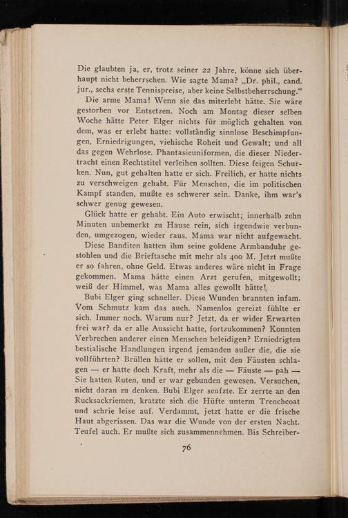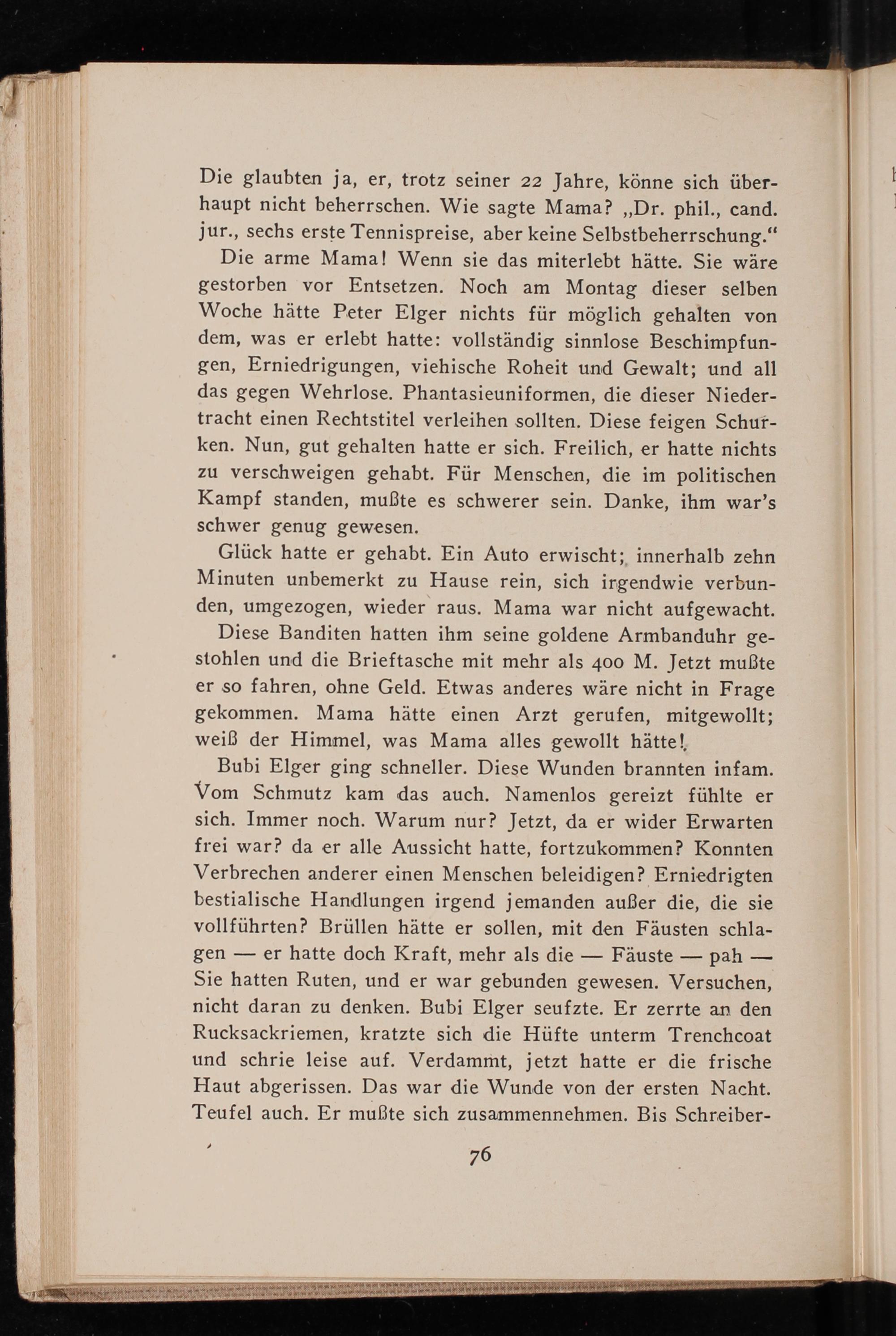 Die arme Mama! Wenn sie das miterlebt hätte. Sie wäre gestorben vor Entsetzen. Noch am Montag dieser selben Woche hätte Peter Elger nichts für möglich gehalten von dem, was er erlebt hatte: vollständig sinnlose Beschimpfungen, Erniedrigungen, viehische Roheit und Gewalt; und all das gegen Wehrlose. Phantasieuniformen, die dieser Niedertracht einen Rechtstitel verleihen sollten. Diese feigen Schurken. Nun, gut gehalten hatte er sich. Freilich, er hatte nichts zu verschweigen gehabt. Für Menschen, die im politischen Kampf standen, mußte es schwerer sein. Danke, ihm war's schwer genug gewesen.