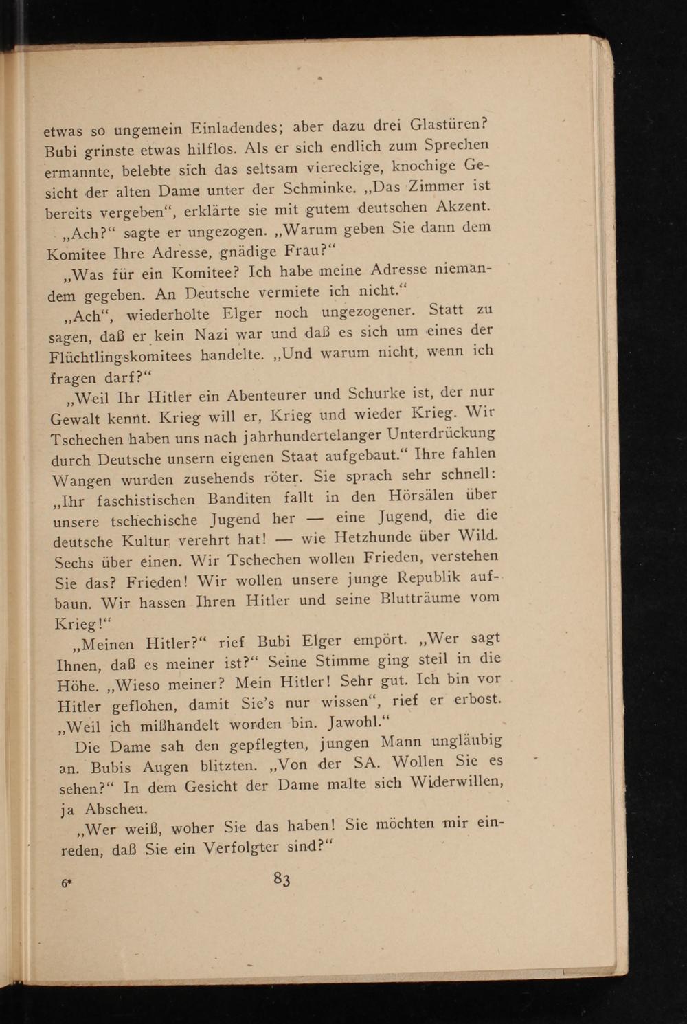 ,, Weil Ihr Hitler ein Abenteurer und Schurke ist, der nur Gewalt kennt. Krieg will er, Krieg und wieder Krieg. Wir Tschechen haben uns nach jahrhundertelanger Unterdrückung durch Deutsche unsern eigenen Staat aufgebaut." Ihre fahlen Wangen wurden zusehends röter. Sie sprach sehr schnell: ,, Ihr faschistischen Banditen fallt in den Hörsälen über unsere tschechische Jugend her eine Jugend, die die deutsche Kultur verehrt hat! wie Hetzhunde über Wild . Sechs über einen. Wir Tschechen wollen Frieden, verstehen Sie das? Frieden! Wir wollen unsere junge Republik aufbaun. Wir hassen Ihren Hitler und seine Blutträume vom Krieg!"