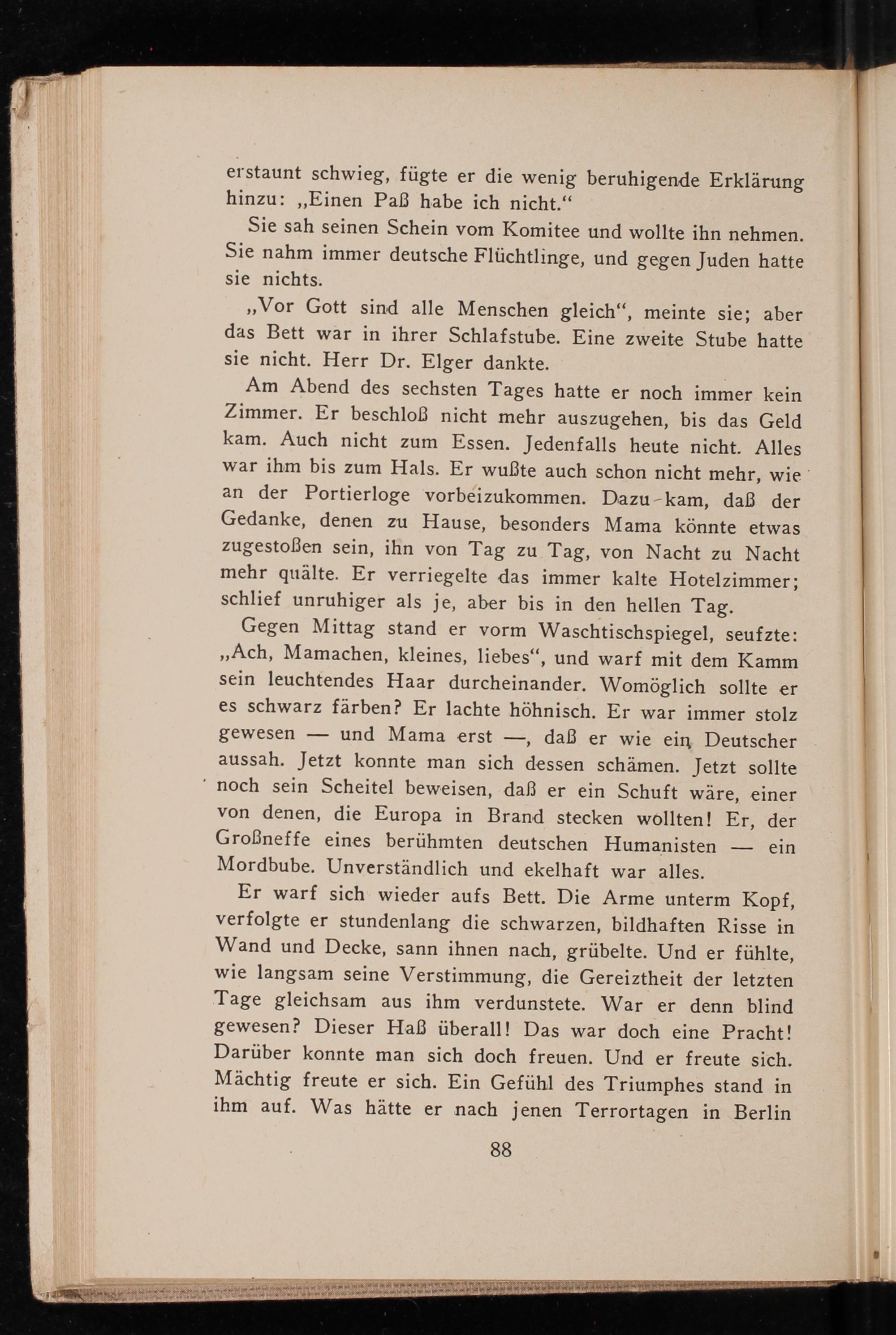 Gegen Mittag stand er vorm Waschtischspiegel, seufzte: ,, Ach, Mamachen, kleines, liebes", und warf mit dem Kamm sein leuchtendes Haar durcheinander. Womöglich sollte er es schwarz färben? Er lachte höhnisch. Er war immer stolz gewesen und Mama erst daß er wie ein Deutscher aussah. Jetzt konnte man sich dessen schämen. Jetzt sollte noch sein Scheitel beweisen, daß er ein Schuft wäre, einer von denen, die Europa in Brand stecken wollten! Er, der Großneffe eines berühmten deutschen Humanisten Mordbube. Unverständlich und ekelhaft war alles. Er warf sich wieder aufs Bett. Die Arme unterm Kopf, verfolgte er stundenlang die schwarzen, bildhaften Risse in Wand und Decke, sann ihnen nach, grübelte. Und er fühlte, wie langsam seine Verstimmung, die Gereiztheit der letzten Tage gleichsam aus ihm verdunstete. War er denn blind gewesen? Dieser Haß überall! Das war doch eine Pracht! Darüber konnte man sich doch freuen. Und er freute sich. Mächtig freute er sich. Ein Gefühl des Triumphes stand in ihm auf. Was hätte er nach jenen Terrortagen in Berlin